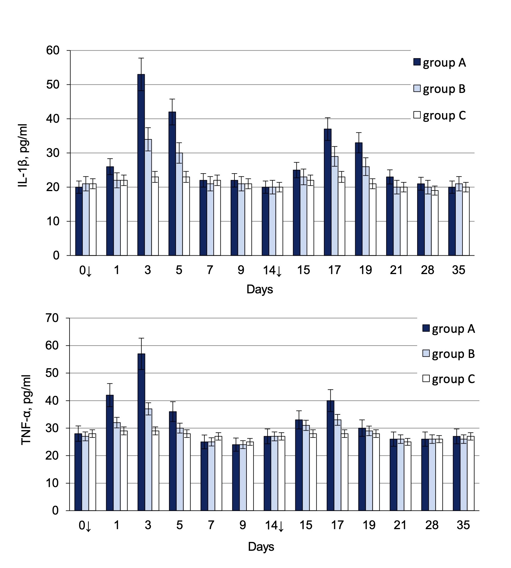 Fig. 3. Dynamic of cytokines TNF-α and IL-1β in C57Bl/6 mice’ sera immunized with the different doses of inactivated CHIKV.