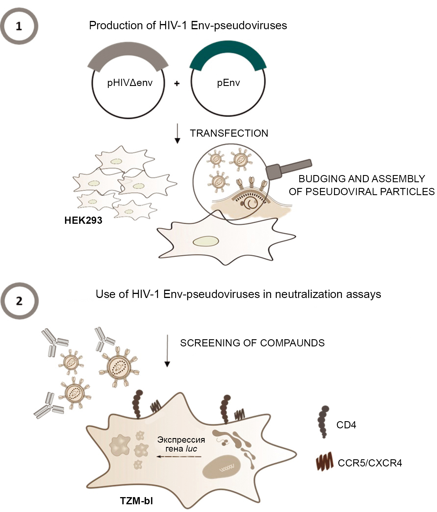 Practical work with HIV-1 Env-pseudoviruses includes two main stages: Stage 1 — assembly of viral particles using transfection of the HEK293 cell line with two plasmids: core (pHIVΔenv) and envelope (pEnv); Stage 2 — neutralization assay using chemotherapeutic agents to determine their ability to block the entry of pseudoviruses into the target cell.