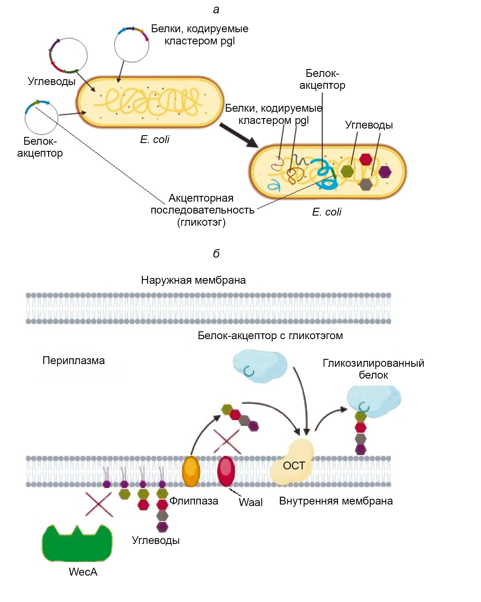 WaaL — О-антиген лигаза E. coli, конкурирующая с рекомбинантной ОСТ за олигосахара; WecA — фермент, катализирующий биосинтез нативных гликанов бактерии-продуцента; флиппаза — фермент, переносящий углеводную последовательность в периплазматическое пространство.