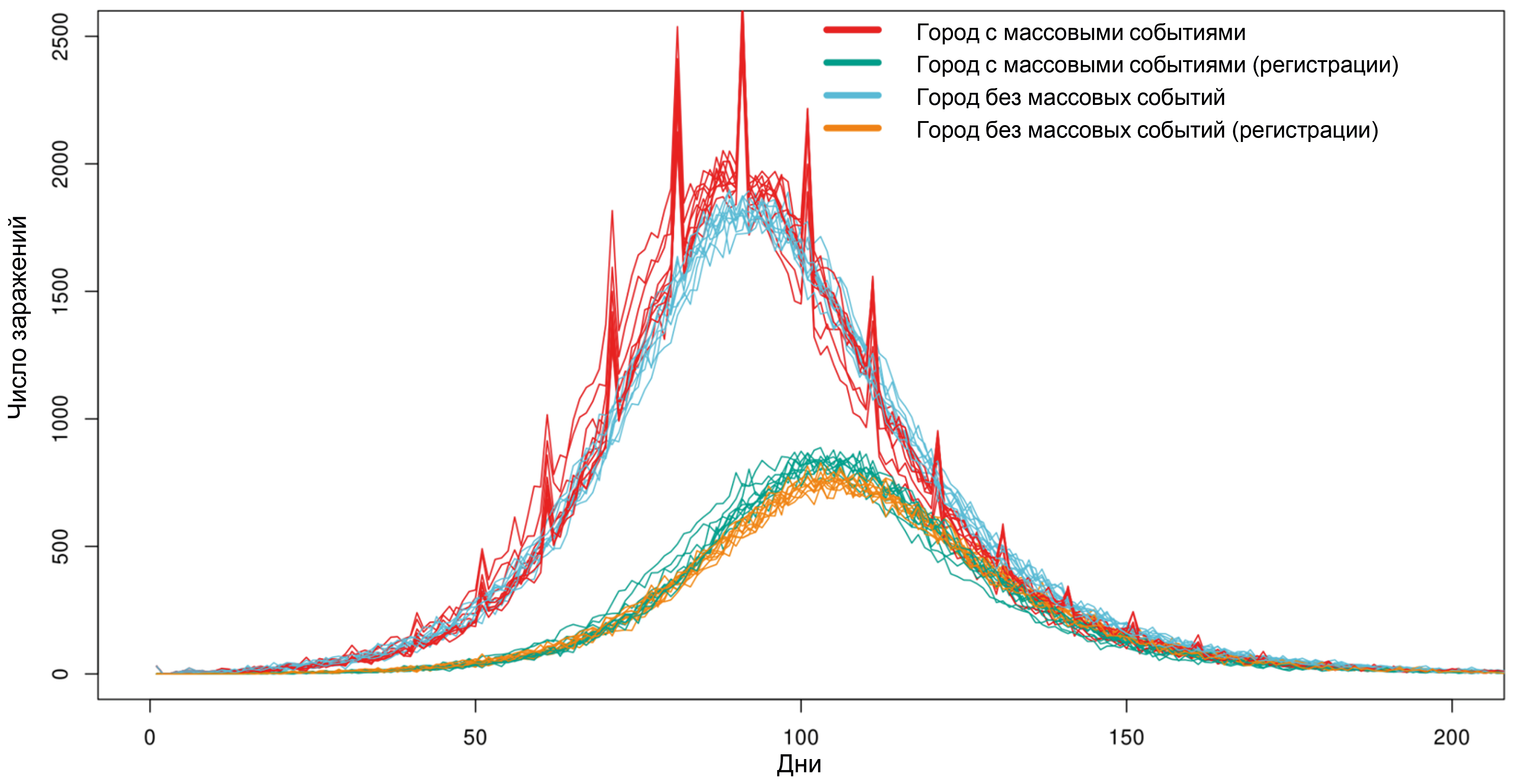 Two cities with a population of 100,000 agents have been given, with anti-epidemic measures in place in the form of social distancing (reducing the frequency of random contacts by 50%, and contacts at school and work by 90%). On the first day in both cities, 30 people were infected with the Delta variant of SARS-CoV-2. The probabilities of testing asymptomatic and symptomatic agents were 1% and 10%, respectively. Every 10 days, mass events are held in one of the cities, with a total number of participants equal to 20,000. The results of 10 simulations for each city are presented in Fig. 1. The occurrence of mass events leads to a sharp increase in the number of infected individuals in the model. However, even a significant number of simultaneous infections (500–1000 compared to the usual 1000–2000 infected per day) cannot be detected through daily testing due to the smoothing of the incidence rate caused by the varying lengths of the incubation period and the uneven delay in reporting positive results, which negates sharp increases in infections.