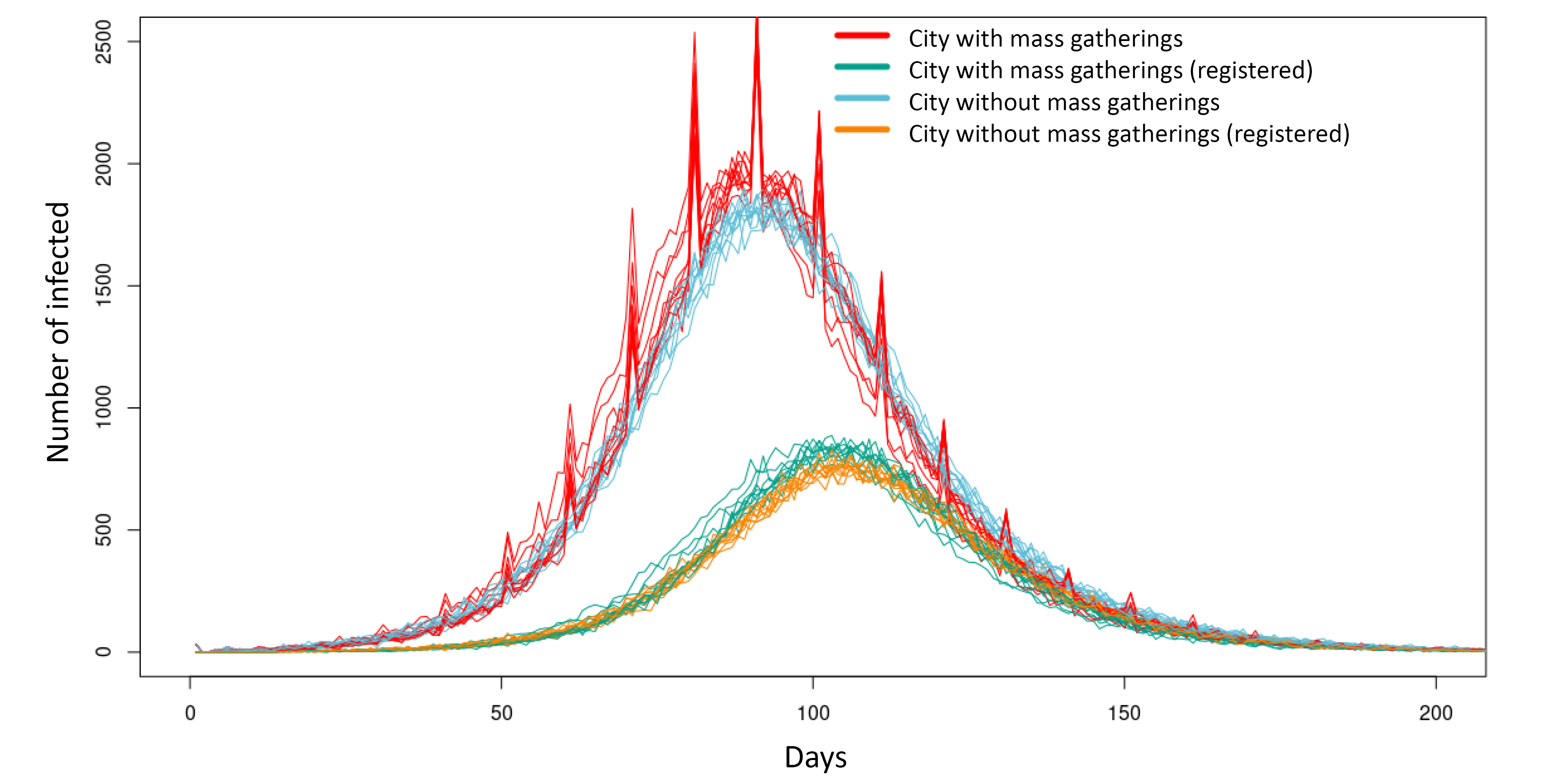 Fig. 1. The impact of holding mass gatherings on the number of SARS-CoV-2 infections in a city with a population of 100,000 agents.