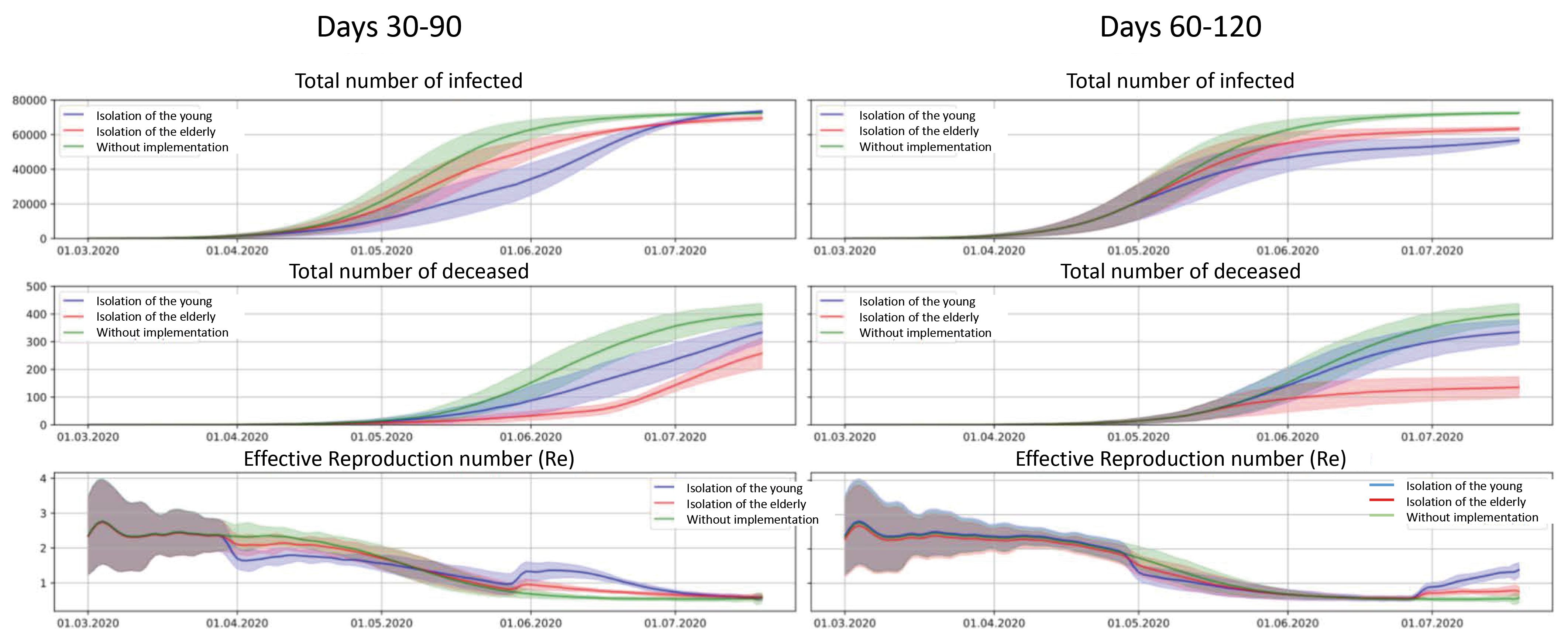 The following hypothetical scenarios were tested on the POEM model. The most effective measures (100% isolation of all contacts) were applied only to young people (< 20 years old) or only to the elderly (> 60 years old) on days 30–90 or 60–120 after the start of the epidemic (at the time the measures were implemented, approximately 1% or 20% of the population was infected, respectively), with the assumption that administrative resources allowed for restrictions to be in place for only 60 days.