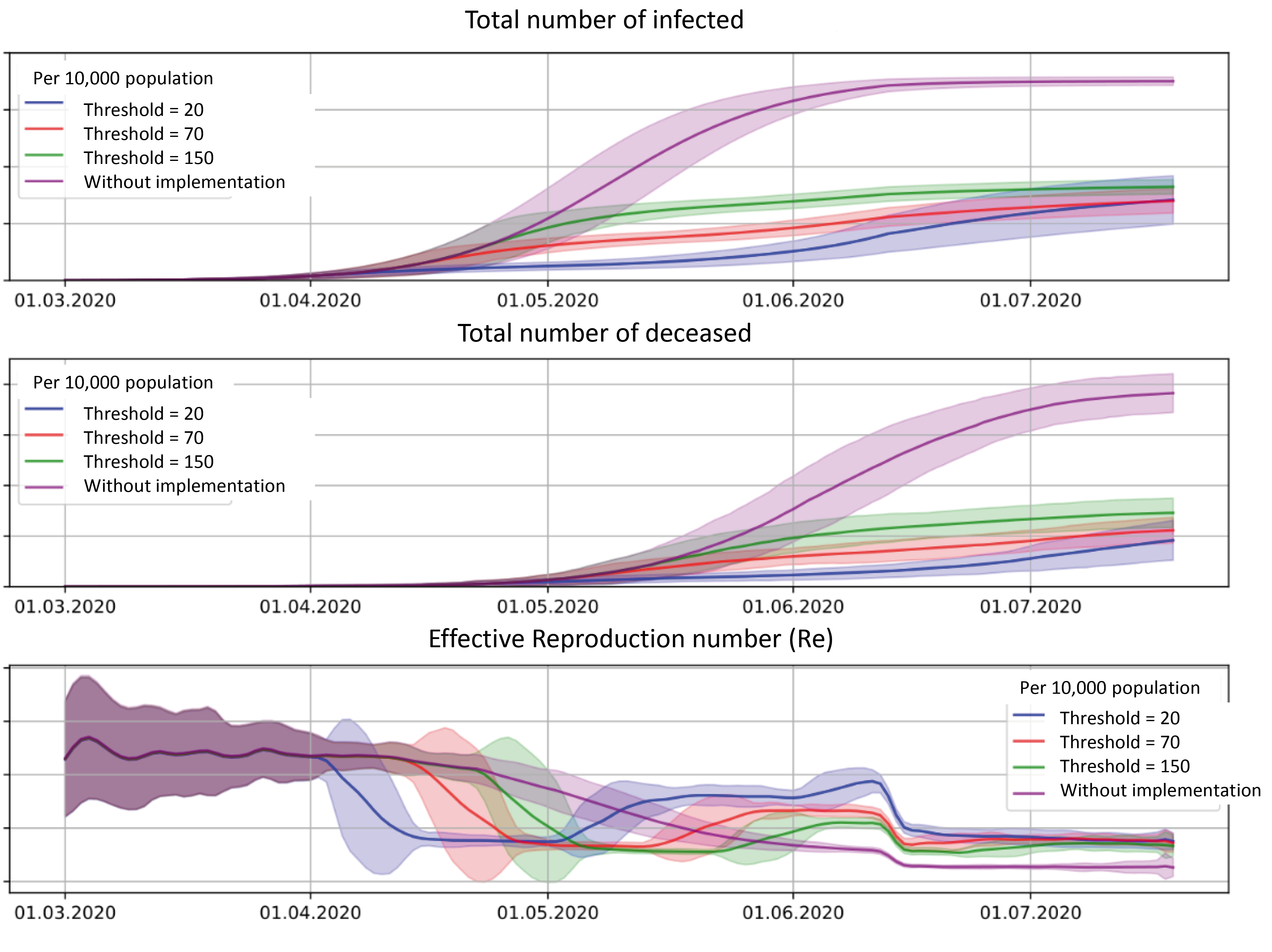 When measures were implemented early, during low COVID-19 prevalence, there was a pronounced effect on the number of infected individuals. However, due to the lifting of restrictions on day 90, by day 140, the number of infected individuals in all groups was practically indistinguishable (Fig. 2). Meanwhile, isolation of both young people and, especially, the elderly led to a 17% and 35% reduction in deaths, respectively, although the confidence intervals for these results partially overlapped.