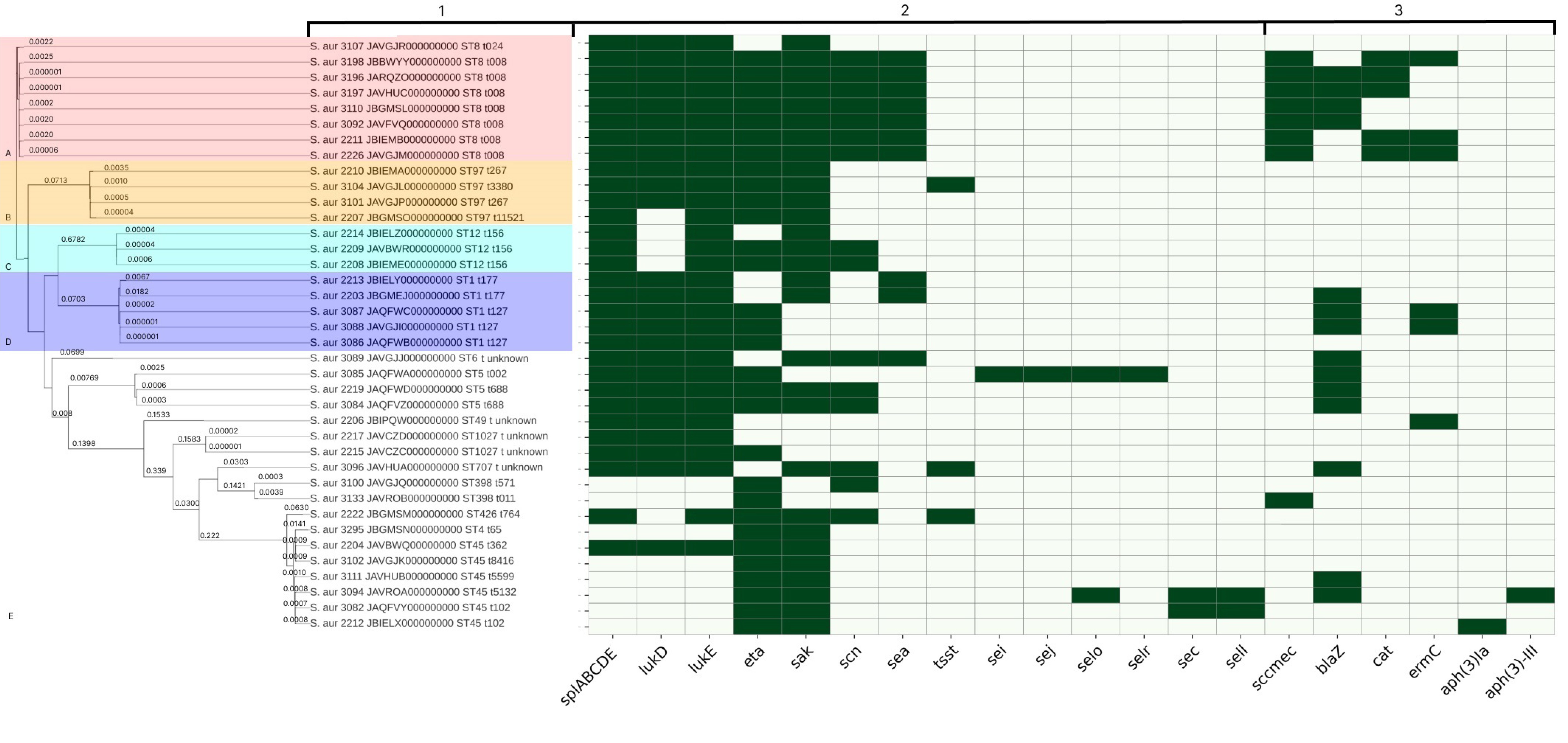 1 — microorganism type, strain number, GenBank database accession number, ST, spa type; 2 — pathogenicity gene determinants (green — presence of the trait, white — absence); 3 — antibiotic resistance determinants (green — presence of the trait, white — absence).