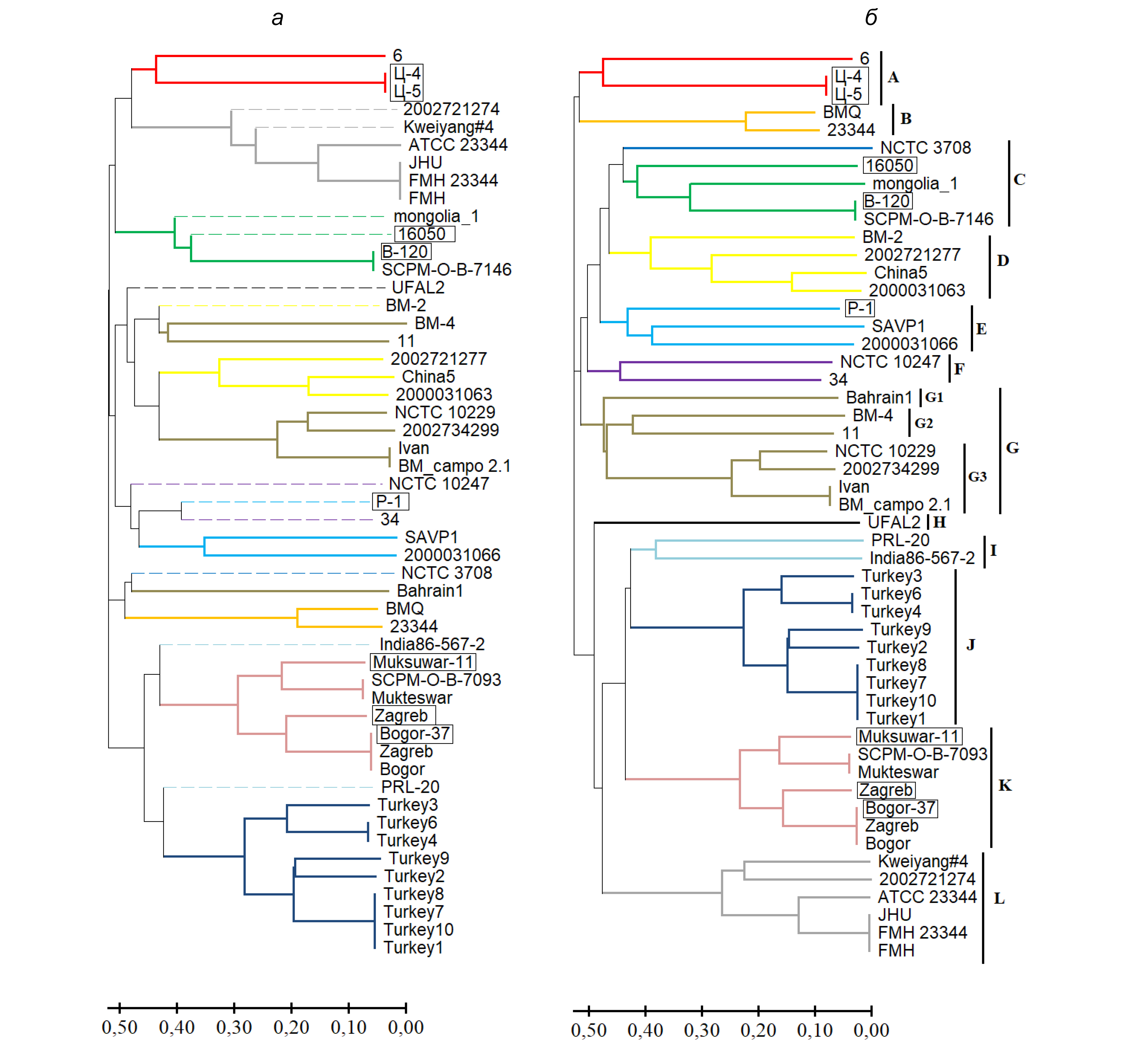 Note. *The MLVA profile of the strains is recorded as a numerical pattern of the number of repeats in the scheme "L933k/L3145k/L3652k/L20k/L1217k/S2862k/BPSS1974#I".