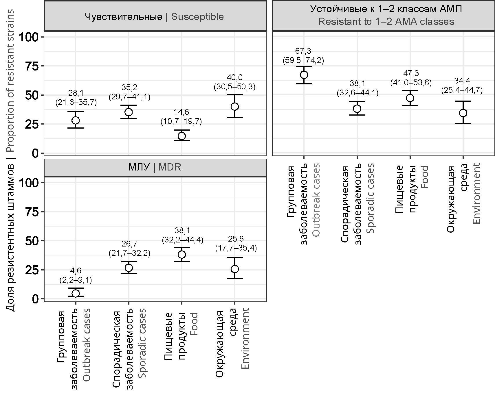 Materials and methods. We studied 752 representative strains of Salmonella of 2494 strains isolated from various sources (clinical samples, food products, environment) received from 59 regions of Russia in the period from 2019 to 2022. The phenotypic resistance to 22 antibiotics of 11 CLSI classes of AMAs was assessed by broth microdilution method (minimum inhibitory concentration). The diversity of resistance profiles of Salmonella serotypes was compared using the Shannon index.