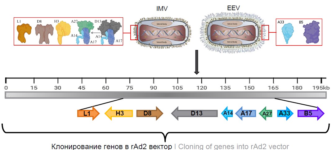 Materials and methods . Recombinant human adenoviruses type 2 (rAd2) carrying surface antigens of vaccinia virus were obtained using homologous recombination in bacteria, followed by adenoviral particle assembly in HEK293 cells. The immunogenic and protective properties of these adenoviruses were tested in BALB/c mice. The presence of antibodies to the vaccinia virus was assessed using ELISA, and survival rates were evaluated in a lethal infection model after intranasal challenge with the vaccinia virus strain Western Reserve.