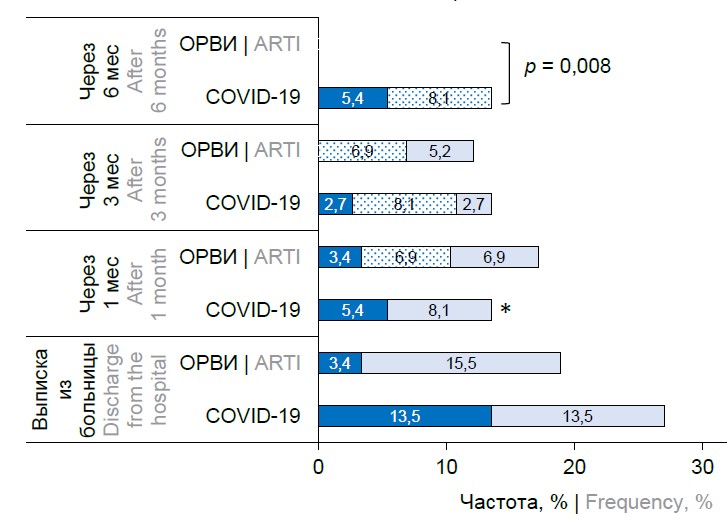 Materials and methods. The prospective study using a continuous sampling method included children under 18 years of age hospitalized with suspected COVID-19, in whom COVID-19 was confirmed by RT-PCR (n = 121) or excluded by molecular and serological methods (ARTI group, n = 105). Information on patients was collected from September 2020 to December 2021 by questionnaires at index points: hospital discharge and after 1, 3, 6 and 12 months. Severe COVID-19 and patients with chronic diseases were excluded. Functional disorders in the anamnesis and any events associated with health disorders during the year of observation, the severity of symptoms were taken into account. The analysis was performed in groups of children < 6 years and ≥ 6 years of age. Symptoms were grouped into clusters.