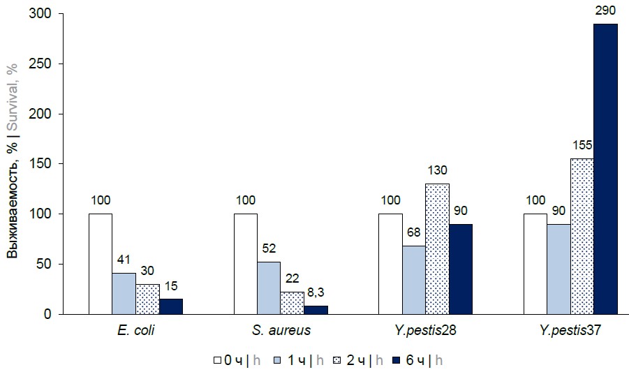 Materials and methods. Bacteremia was modeled by adding Y. pestis EV NIIEG cells grown at 37оC or 28оC to whole blood (with heparin) at a dose of 108 mc/mL. Strains Staphylococcus aureus ATCC 6538 (209-P) and Escherichia coli ATCC 25922 were used in experiments with blood from the same donors as a positive control. The bactericidal effect was determined at different time points during blood incubation at 37оC (for 6 hours) using a microbiological method. Using flow cytometry, immunophenotyping of leukocytes was performed in the blood according to the Lyse/No-Wash protocol to determine the expression of the main leukocyte antigen CD45 and the secretory azurophilic degranulation marker CD63 on the surface of the granulocytes. The intensity of granulocyte lysis was assessed by the decrease in the proportion of these cells in the total leukocyte population.
