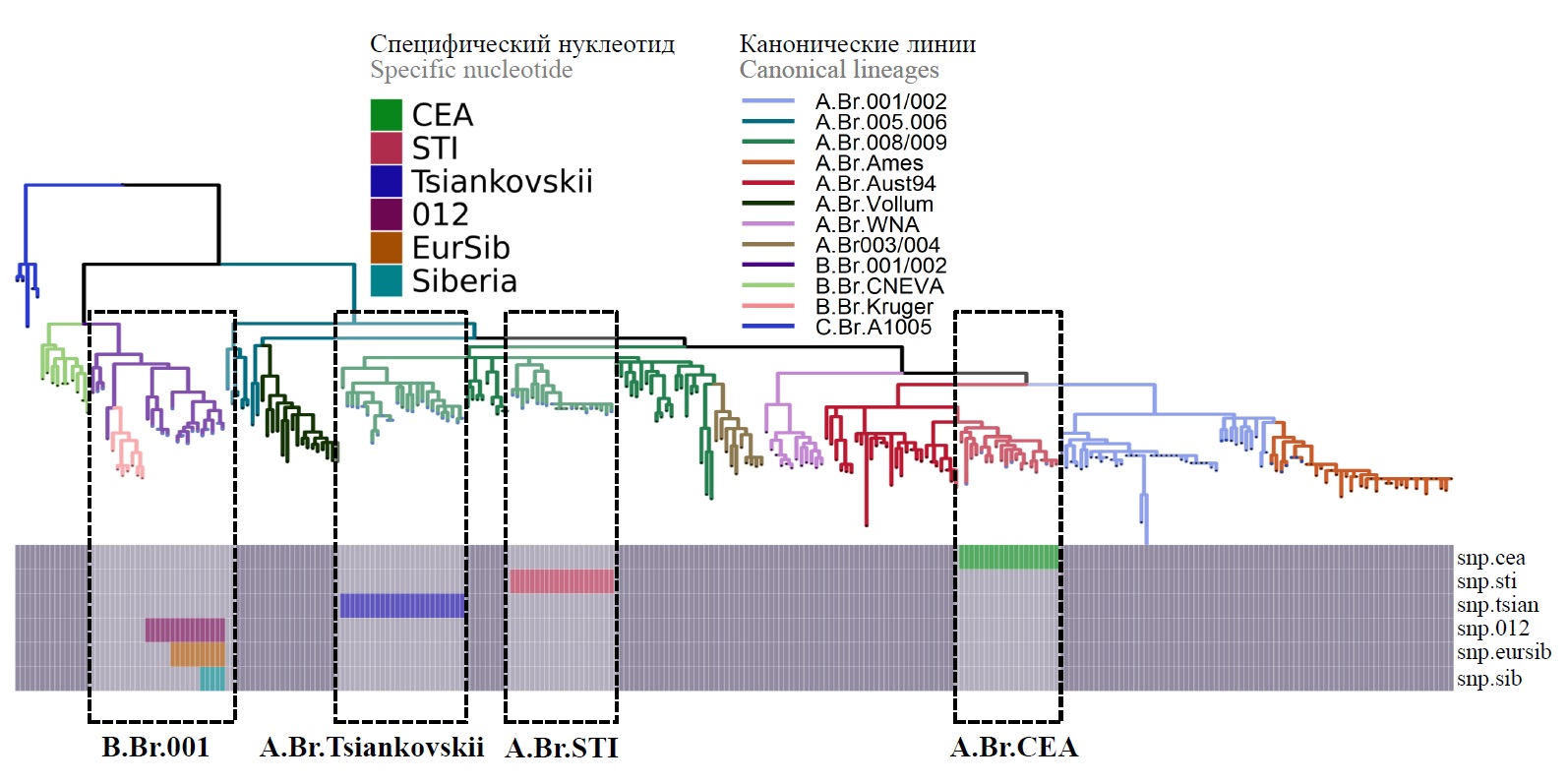 Conclusion. Thus, marker SNPs were selected to determine the genetic subclusters A.Br.CEA, A.Br.STI, A.Br.Tsiankovskii, B.Br.Europe, B.Br.Siberia, B.Br.Asia, B.Br.018, and a new laboratory method was developed for molecular subtyping of B. anthracis using HRM PCR.