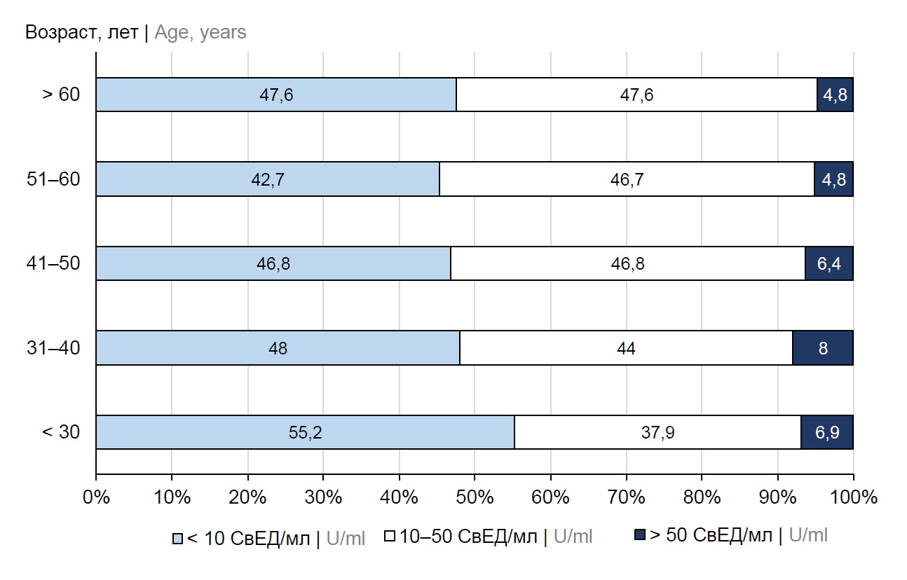 Results. The proportion of healthcare workers seronegative for pertussis was 46.8%. The healthcare workers with unknown vaccination status amounted to 40.5%. More than half (55.6%) of the participants have been vaccinated and 3.9% of them have had pertussis in childhood. A recent infection was confirmed in 8.0% of participants who had the level of antibodies to Bordetella pertussis greater than 50 U/ml. The largest proportion of participants seronegative to Bordetella pertussis (55.2%) was observed among those under 30 years. The median level of antibodies against pertussis in seropositive health workers was 28.3 U/ml.