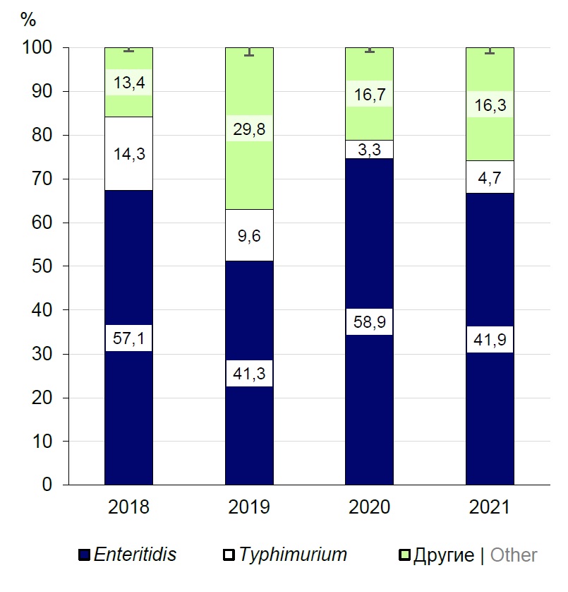 Conclusion. All the bacterial isolates were phenotypically susceptible to first-line antibiotics used in treatment of salmonellosis: fluoroquinolones and third-generation cephalosporins. The whole-genome sequencing of multidrug-resistant Salmonella isolates (19.0%) detected resistance genes for 9 groups of antibiotics: aminoglycosides (100%), beta-lactams (57.4%), fluoroquinolones (16.2%), tetracyclines (51.5%), macrolides (1.5%), phenicols (30.4%), trimethoprim (13.0%), sulfonamides (47.8%) and colistin (1.4%). Thus, epidemiological surveillance of the Salmonella spread through the food chain is of critical importance for the monitoring of antimicrobial resistance among foodborne Salmonella.