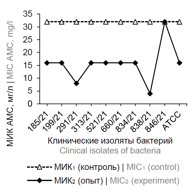 Results. During the adaptation of clinical isolates of K. pneumoniae to povidone-iodine, an increase in the sensitivity of bacteria to antibiotics was shown. The minimum inhibitory concentrations (MIC) of 11 antibacterial agents in relation to the studied cultures decreased by an average of 2.35–23.2 times compared with the control values. Under the experimental conditions, the sensitivity of the studied cultures increased to amoxicillin/clavulanic acid by ≥ 2 – ≥ 8 times, piperacillin/tazobactam — by ≥ 2 – ≥ 32 times, ceftazidime — by 4 – ≥ 16 times, ami-kacin — 2 – ≥ 16 times, ertapenem — 2.0–8.0 times, meropinem — 2–8 times, cefepim — ≥ 4 – ≥ 64 times, ciprofloxacin — 4 – ≥ 16 times, gentamicin — 2 – ≥ 8 times, norfloxacin — 2–8 times, nitrofurantoin — 2–4 times. An increase in the level of sensitivity to antibiotics was found in 50–100% of the studied clinical bacterial isolates. A similar effect has not been established for ampicillin, cefotaxime, imipenem, and trimethoprim/sulfamethoxazole. It should be noted that under the conditions of the experiment, intraspecific heterogeneity of clinical isolates of K. pneumoniae was revealed in terms of the level of acquired sensitivity to antibacterial agents.