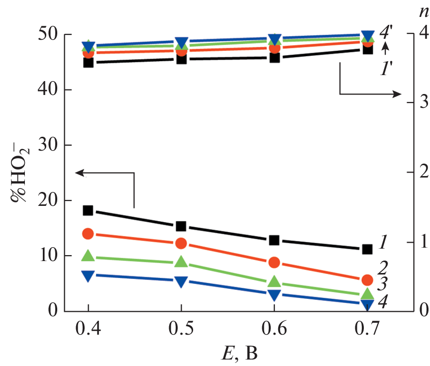 The effect of the support nature and the mass of platinum on the stability, electrochemical characteristics of monoplatinum catalysts, and the reaction path of electrochemical oxygen reduction in alkaline electrolyte is studied. Catalysts with the Pt mass content of 10, 20, 40, 60 wt % are synthesized by the polyol method on carbon nanotubes functionalized in NaOH and doped with nitrogen. The activity, the percentage of hydrogen peroxide formed, and the number of electrons participating in the oxygen reduction reaction are determined from the data obtained by the rotating ring-disk electrode method. For catalysts synthesized on the nitrogen-doped carbon nanotubes, the highest selectivity in the reaction of oxygen reduction to water is observed; the higher Pt surface area at the electrode, the greater is the selectivity, because the contribution of the support surface to the total oxygen reduction reaction decreased. Both the presence of hydrogen peroxide and a decrease in stability result from the decrease in the platinum content in the catalyst.