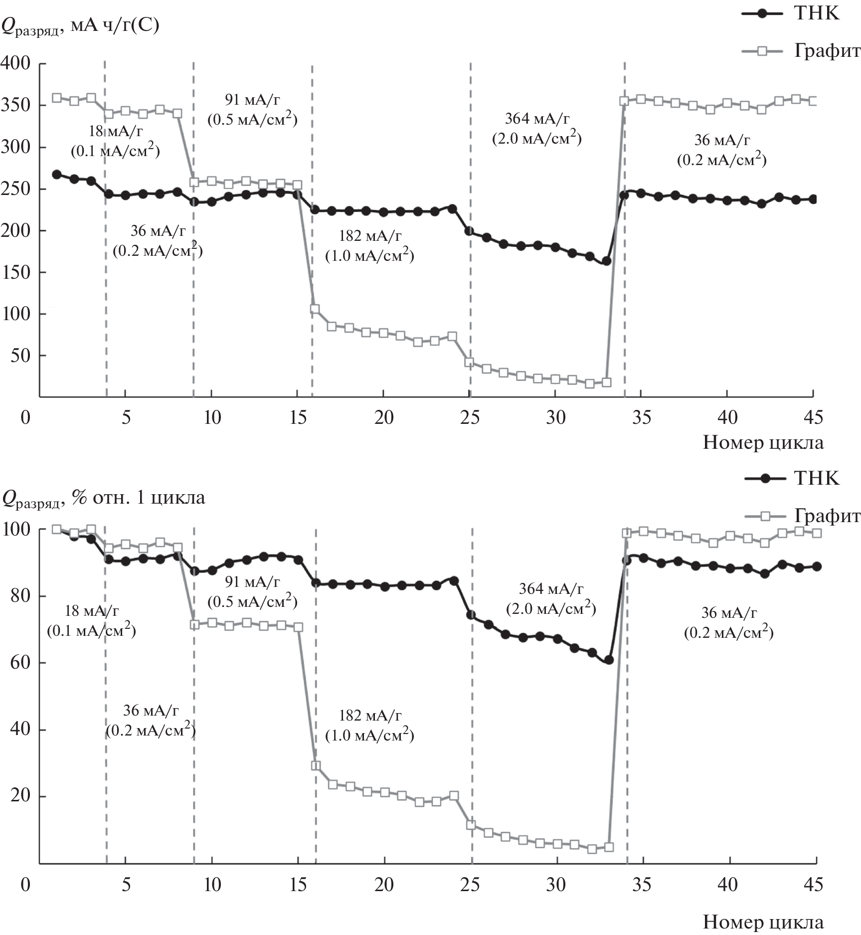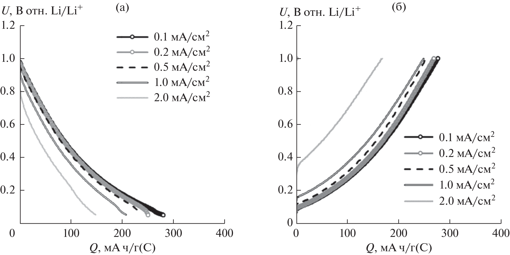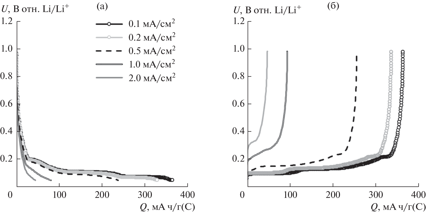 The results of comparative studies of the effect of current density on the average discharge voltage and specific discharge capacity of carbon electrodes based on heat-treated petroleum coke and graphite are presented. The carbon obtained by heat treatment of petroleum coke is shown to have better kinetic characteristics than graphite. The increase in the current density from 0.2 mA/cm2 (36 mA/g) to 2 mA/cm2 (364 mA/g) leads to a decrease in the discharge capacity of heat-treated petroleum coke by 26%; graphite, by 93%. When the current density is restored to 0.2 mA/cm2, the discharge capacity of carbon electrodes is also restored to its initial value. The increase in the current density is also shown to lead to increase in the average discharge voltage of lithium–carbon cells. Thus, with the increase in current density from 0.2 to 2 mA/cm2, the average discharge voltage of the lithium–carbon cells with the electrode active component of the heat-treated petroleum coke increased from 0.39 to 0.62 V; that of graphite, from 0.14 to 0.35 V.