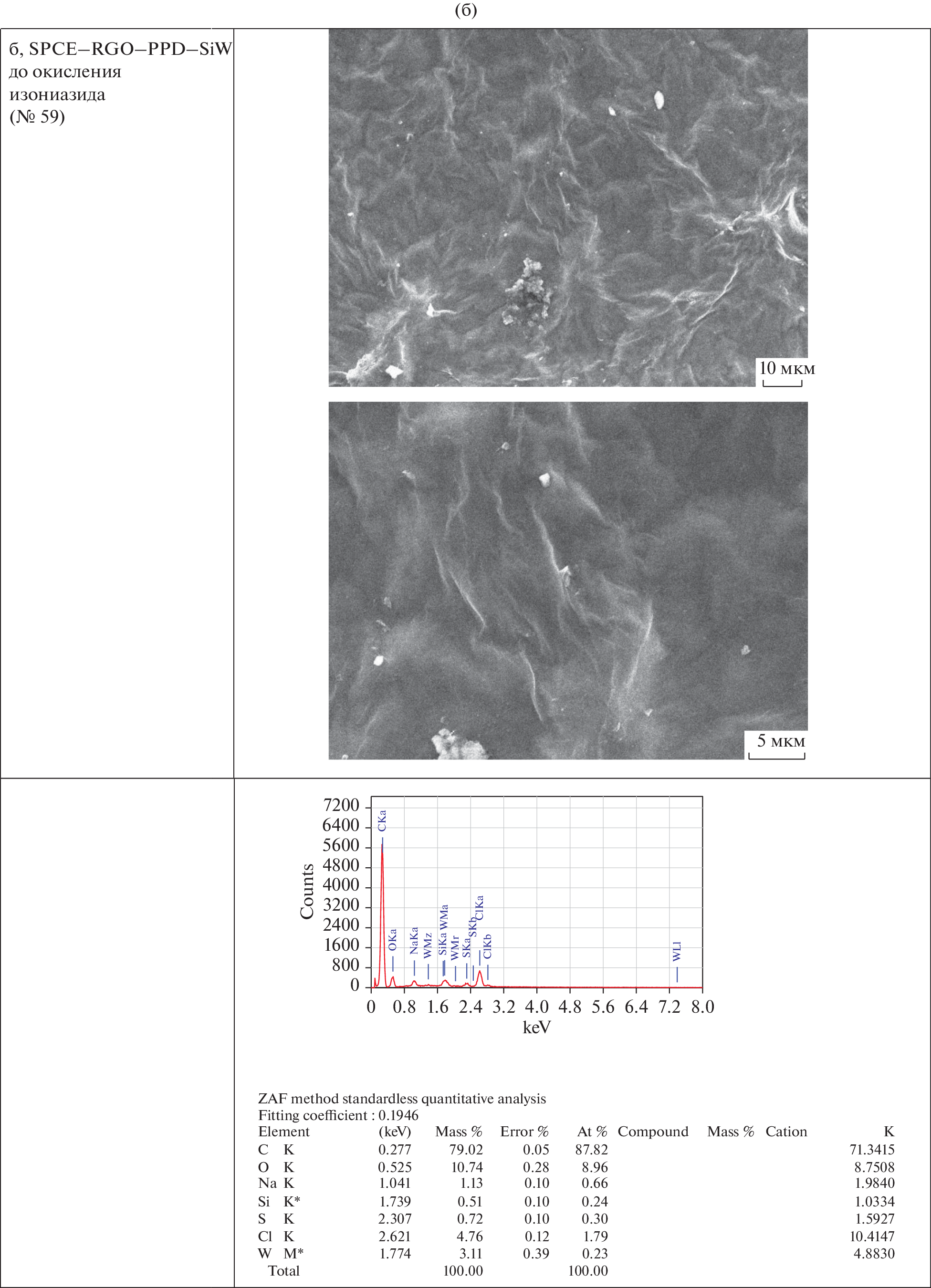 A new redox-active composite material based on reduced graphene oxide (RGO), poly-o-phenylenediamine (PPD), and silicotungstic acid (SiW) is studied. The SEM data showed an abrupt decrease in the content of oxygen atoms in the composite as compared to pure graphene oxide (GO). This is associated with its reduction to RGO in the course of RGO–PPD–SiW synthesis. A combination of RGO conductivity and redox catalysis due to the electroactive components (PPD and SiW) enables one to develop various sensors by applying RGO–PPD–SiW onto planar electrodes (screen-printed carbon electrodes, SPCE). In this work, the possibility of developing a sensor for the content of antituberculous antibiotic isoniazid (isonicotinic acid hydrazide C6H7N3O, INAH) is studied. Using the CVA method, it is shown that the concentration dependence of isoniazid oxidation current is linear. The electrocatalytic behavior of the composite during the isoniazid oxidation is also supported by the impedance spectroscopy.