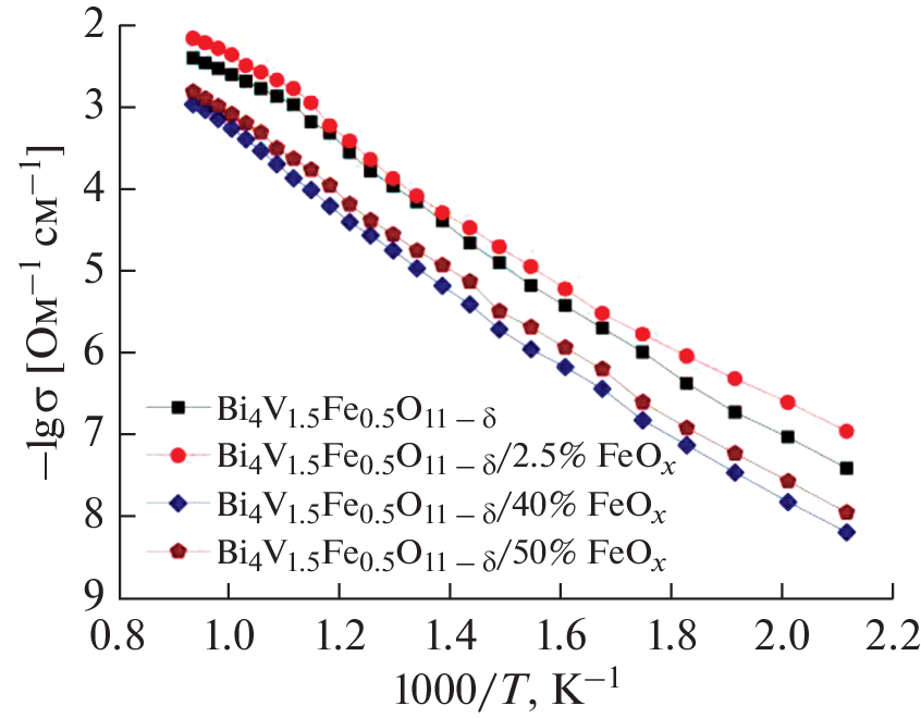 The structure and electrophysical characteristics of Bi4V2 – хFeхO11 – δ (BIFEVOX, where х = 0.3, 0.5) and its heterogeneous mixtures Bi4V2 – хFeхO11 – δ/n% FeOy and Bi4V2 – хFeхO11 – δ/m% Al2O3 are studied by varying their composition and the thermodynamic parameters of the environment. The crystallochemical parameters of individual compounds are calculated. The phase and elemental composition of samples is assessed using the XRD method and the scanning electron microscopy with energy-dispersive spectroscopic microanalysis; for individual phases, the absence of phase transitions is observed. The conductivity of materials is studied by the impedance spectroscopy. No composite effect is observed in these systems.
