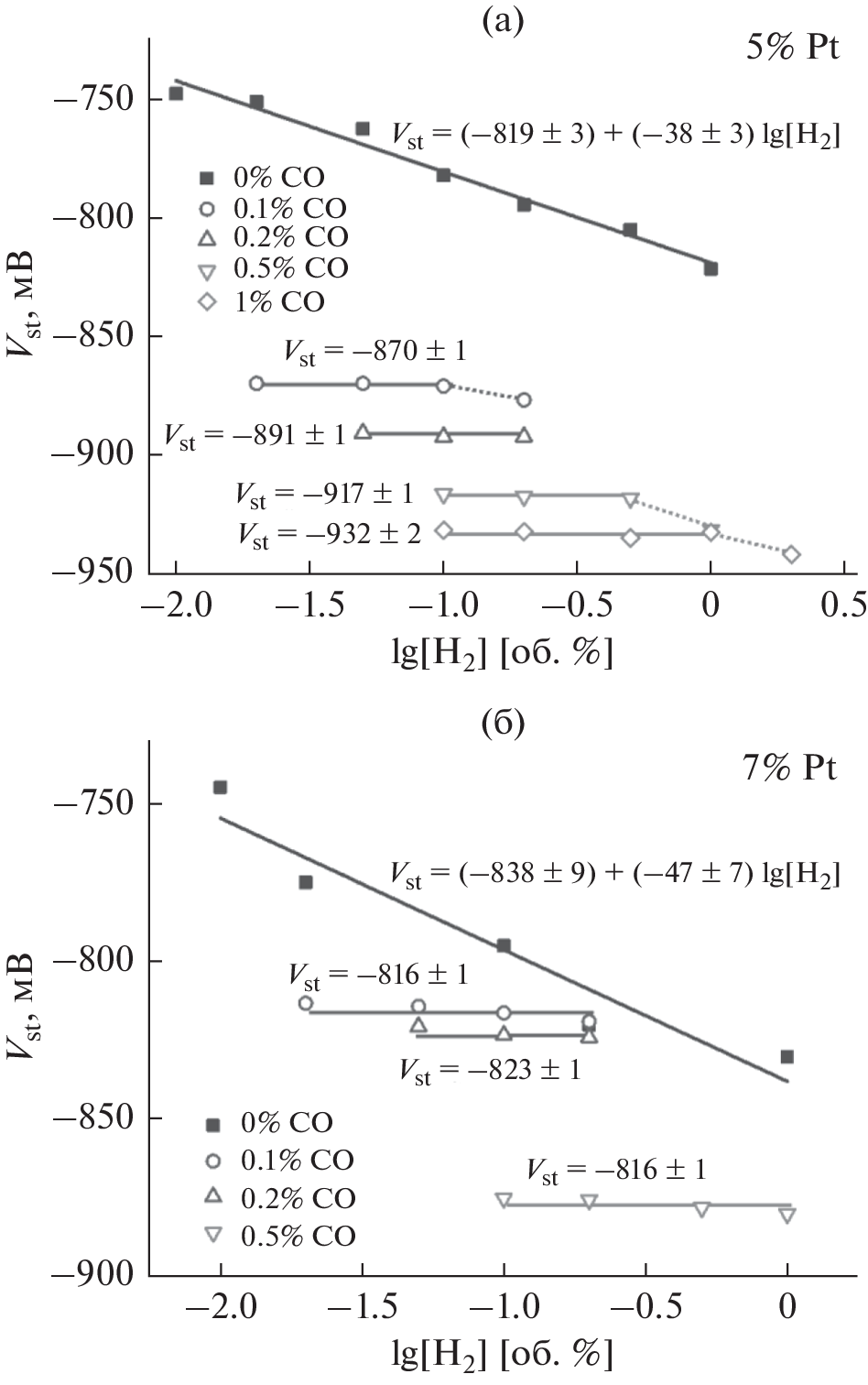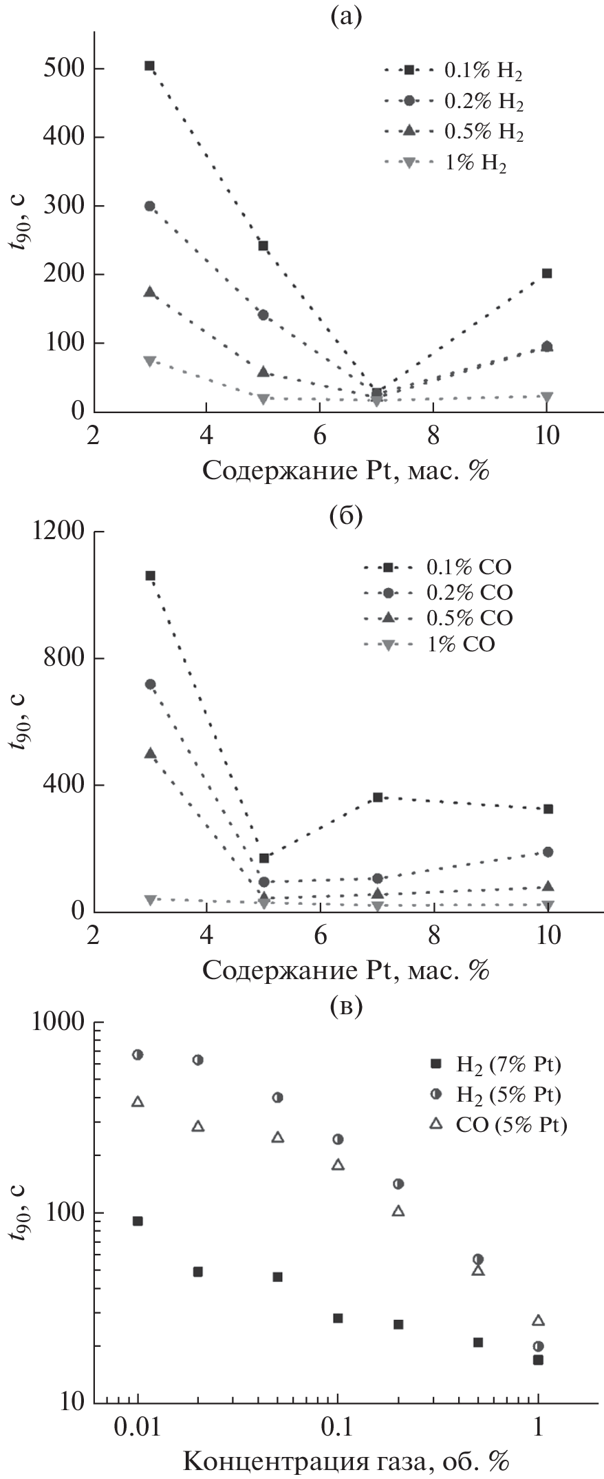 The effect of the platinum content (3–10 wt %) in the Pt/SnO2(Sb)-based working-electrode material on the properties (sensitivity, high-speed performance, recovery time) of solid-state potentiometric gas sensors for hydrogen and carbon monoxide including their simultaneous presence in air is studied. Sensors with 5% Pt demonstrate the best characteristics: the efficient carbon-monoxide detection for its concentration from 0.01 to 1 vol %; no effect of hydrogen present in the CO + air mixture in concentrations comparable with the CO concentration; the shortest relaxation time (~30 s at 1% CO).