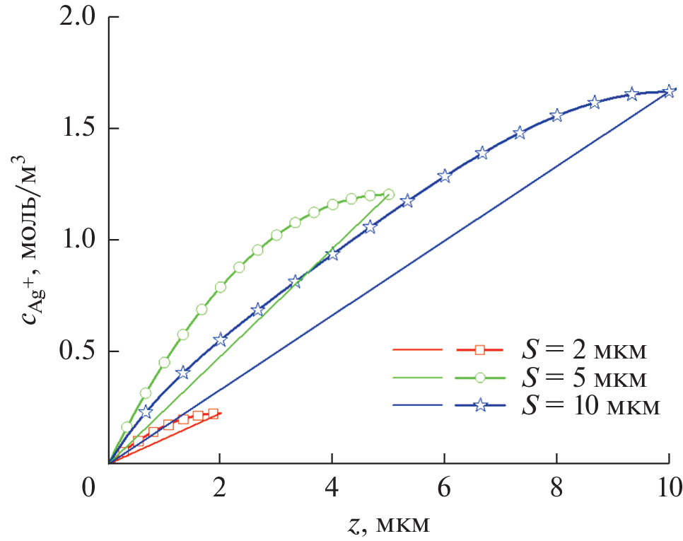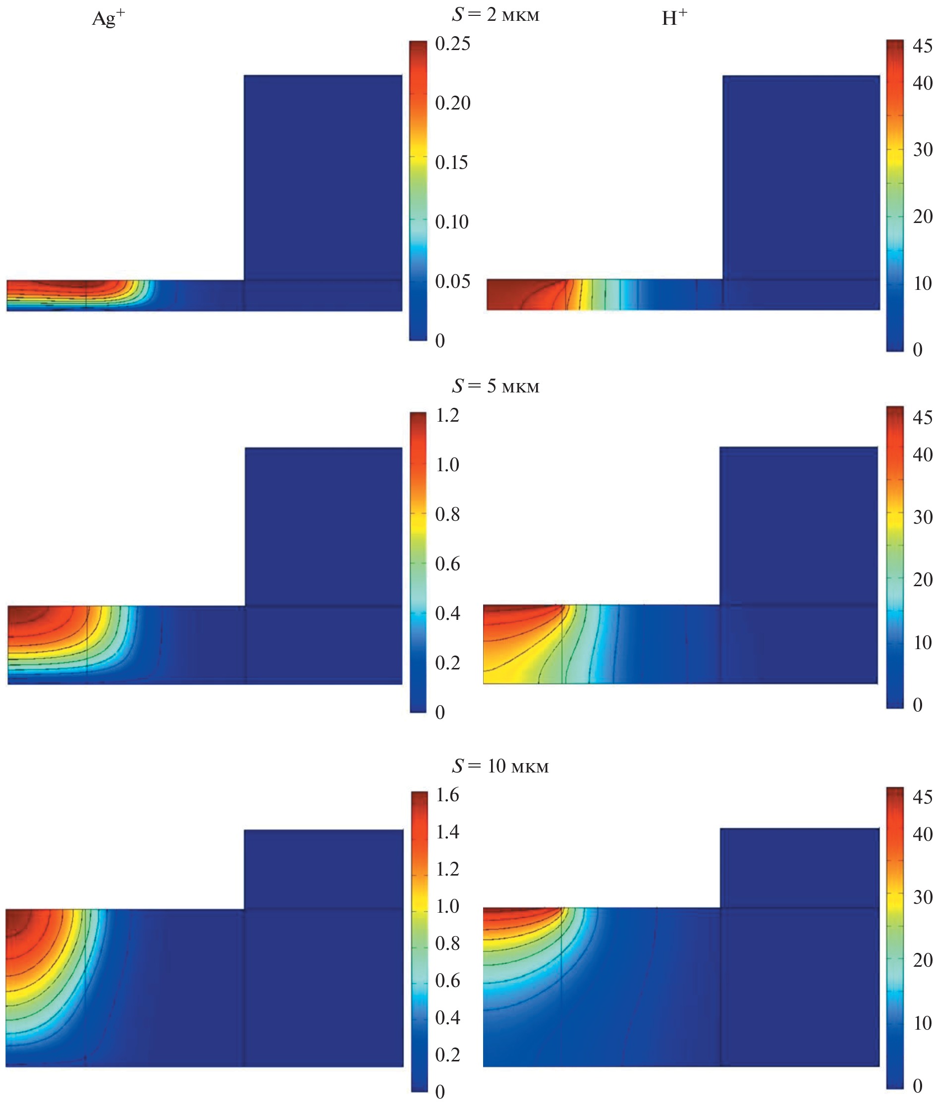 The distributions of the concentrations of the participants in the reactions and the current density of silver ion reduction are calculated for various concentrations of solution components and interelectrode distances. The degree of localization of metal deposition depends on the distribution of the concentrations of electroactive silver cations and the nonelectroactive complex of this metal near the anode. The conditions for reaching the maximum rate of local silver electrodeposition are determined.