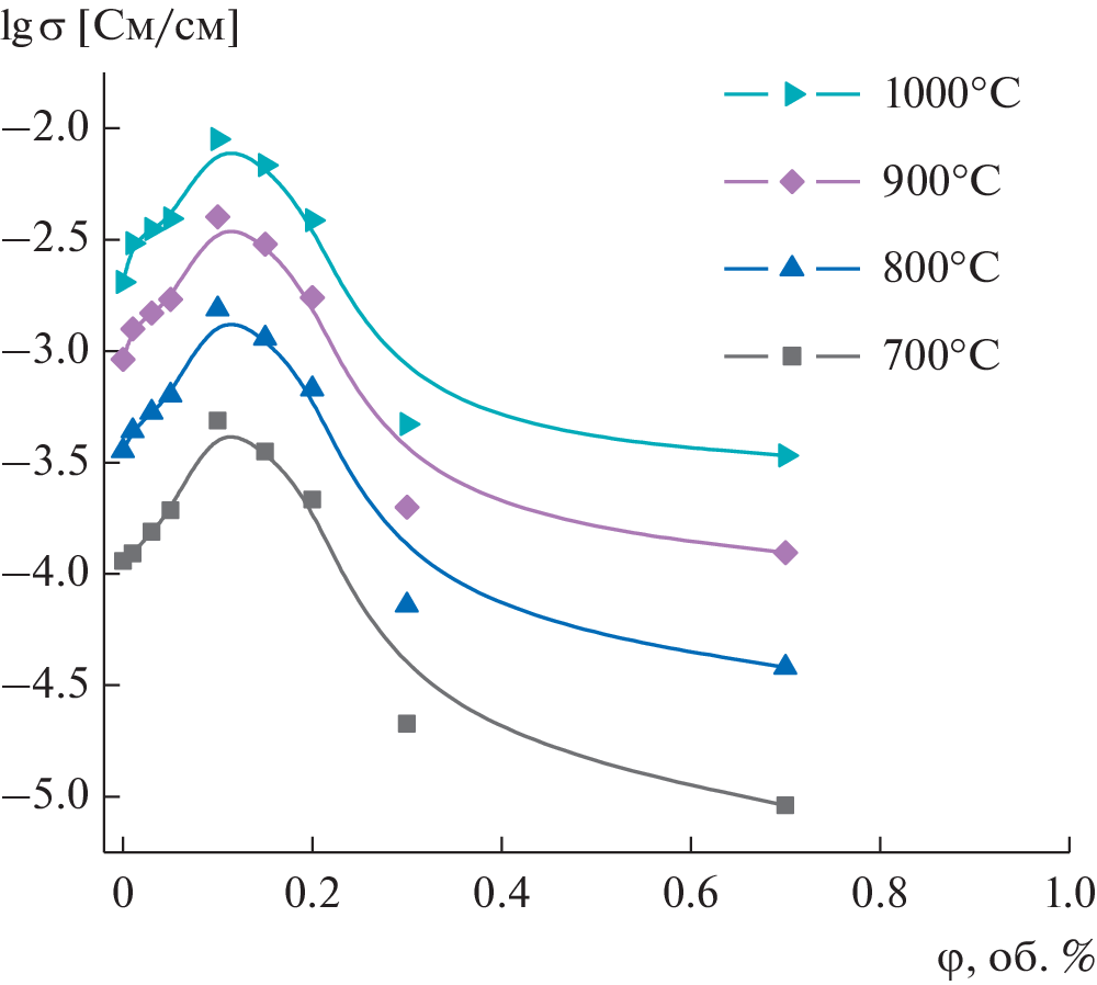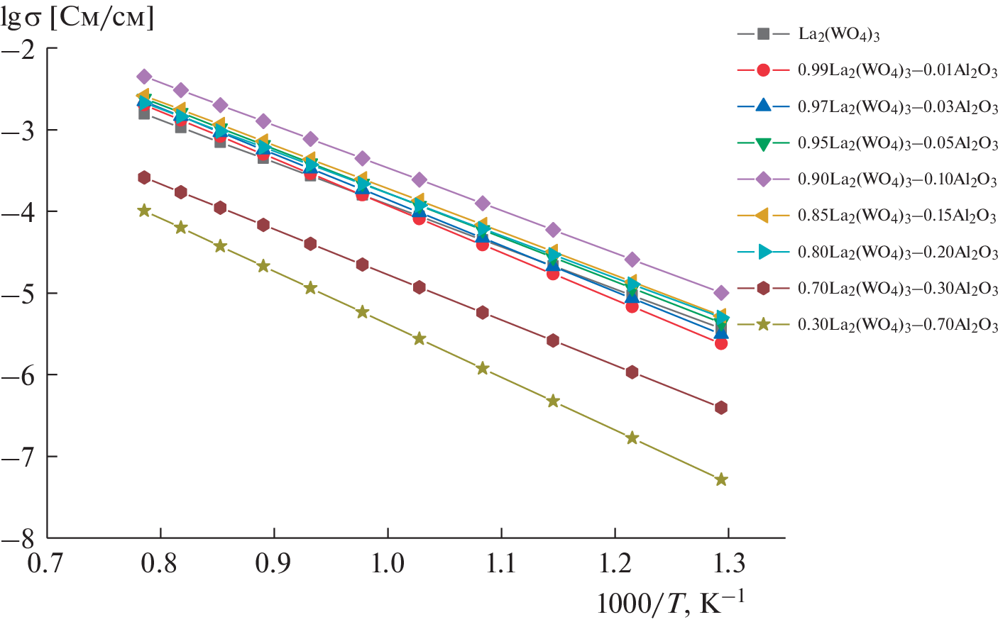 Composites (1-φ)La2(WO4)3 – φAl2O3 (φ is the volume fraction of nanodispersed aluminum oxide) were obtained by the solid-phase method, their thermal properties, morphology, electrical conductivity depending on temperature, oxygen pressure in the gas phase, and composition were studied. It was found that the conductivity of composites (1-φ)La2(WO4)3 – φAl2O3 passes through a maximum at φ ~ 0.1 and reaches a value of 7 10-3 S/cm at 1000°C, which is 7 times higher than the conductivity of La2(WO4)3 at given temperature. Using the EMF method and measuring the dependence of electrical conductivity on oxygen pressure in the gas phase, the ionic nature of the conductivity of (1-φ)La2(WO4)3 – φAl2O3 composites was established.