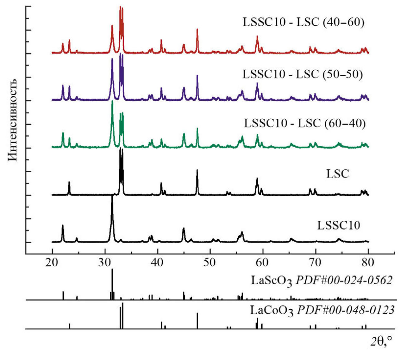 Рис. 1. Рентгенограммы образцов LSSC10; LSС; LSSC10 – LSС (60–40); LSSC10 – LSС (50–50) и LSSC10 – LSС (40–60), а также штрихрентгенограммы LaScO3 и LaCoO3 из базы данных PDF.