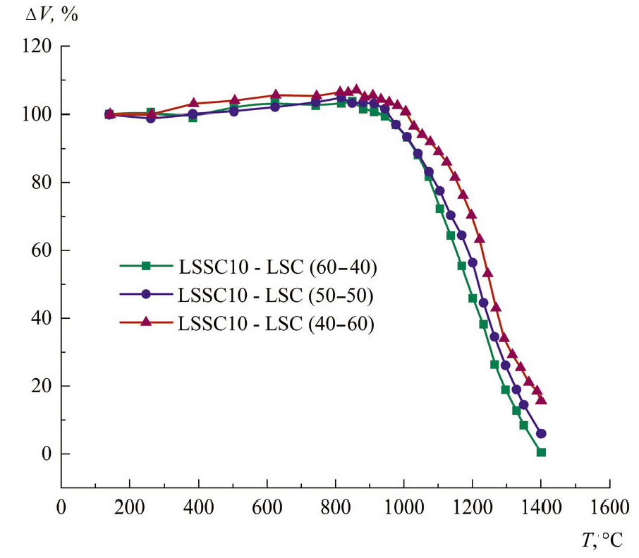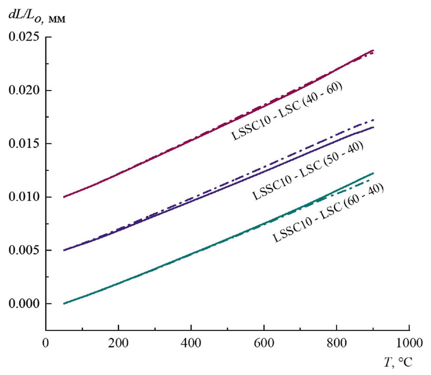 Синтез индивидуальных материалов La0.9Sr0.1 Sc0.9Co0,1O3 – δ (LSSC10) и La0.9Sr0.1CoO3 – δ(LSC) проводили цитрат-нитратным методом с последующим отжигом. Методом РФА показано, что получены однофазные материалы со структурой типа перовскита с пространственными группами Pnma и R-3c соответственно (рис. 1). Композитные материалы получали путем механического смешения однофазных порошков в планетарной мельнице с последующим прессованием и спеканием. Процессы формирования композитов LSC – LSSC10 в процессе термообработки исследованы in situ методами высокотемпературной оптической дилатометрии и приведены на рис. 2. По характеру зависимостей можно видеть, что увеличение доли LSSC10 в композите с 40% до 60% ускоряет процесс спекания, но в целом варьирование соотношения LSSC10 и LSC в пределах 20 мас.% не приводит к большим изменениям в спекаемости композита. Основные процессы спекания керамики проходят при температурах 1000–1400 оC. Для получения пористых и дисперсных электродных слоев спекание нужно проводить, учитывая эти данные.
