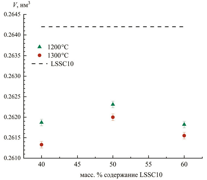 Рентгенофазовый анализ композитных материалов показал отсутствие пиков дополнительных фаз (рис. 1). Для исследования процессов сосуществования фаз композита проводили синтез при двух разных температурах спекания 1200 и 1300 оC. По результатам полнопрофильного анализа параметры решетки фазы LSSC10 ниже в составе композита в сравнении с объемом решетки индивидуального материала. При увеличении температуры спекания композитов объем элементарной ячейки снижается еще больше (рис. 3). Ранее показано, что введение Co в фазу скандата лантана приводит к снижению объема элементарной ячейки [22]. Наличие аналогичных тенденций косвенно позволяет предположить диффузию кобальта в композите из фазы LSC в фазу LSSC10. При повышении температуры спекания диффузия ускоряется и параметры решетки образцов снижаются более выраженно для композитов с большим содержанием фазы LSC, т. е. при большем содержании кобальта в образце. Данное наблюдение также подтверждает предположение о диффузии кобальта из LSC в LSSC10. Все дальнейшие результаты приведены для образцов, спеченных при 1200 оC.
