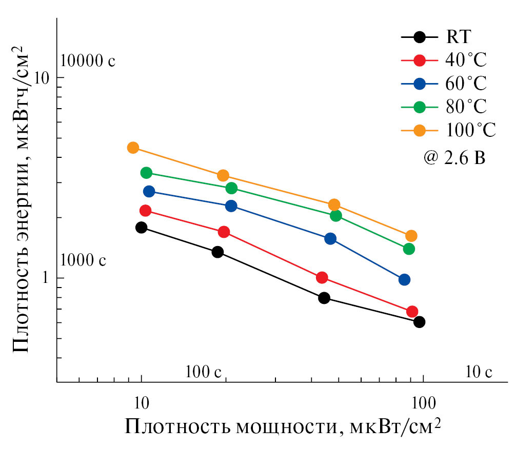 В работе [58] сообщается об изготовлении и электрохимических характеристиках ЭХСК нового типа, состоящего из лазерно-индуцированных графеновых (ЛИГ) электродов, полученных путем лазерной обработки полиимидной фольги и ионной жидкости бис(трифторметансульфонил)имида 1-бутил-1-метилпирролидиния в качестве электролита. Эта комбинация позволяет разработать гибкий микросуперконденсатор, пригодный для применения в суровых условиях. Было обнаружено, что условия работы лазера сильно влияют на поверхностную емкость, позволяя достичь около 4 мФ/см2 при измерениях гальваностатическим методом заряда-разряда при 10 мкА/см2, с максимальным диапазоном рабочего напряжения 3 В. Такие ЭХСК работают до +100 оС. На рис. 1 приведена диаграмма Рагона для температур от +40 до +100 оС.