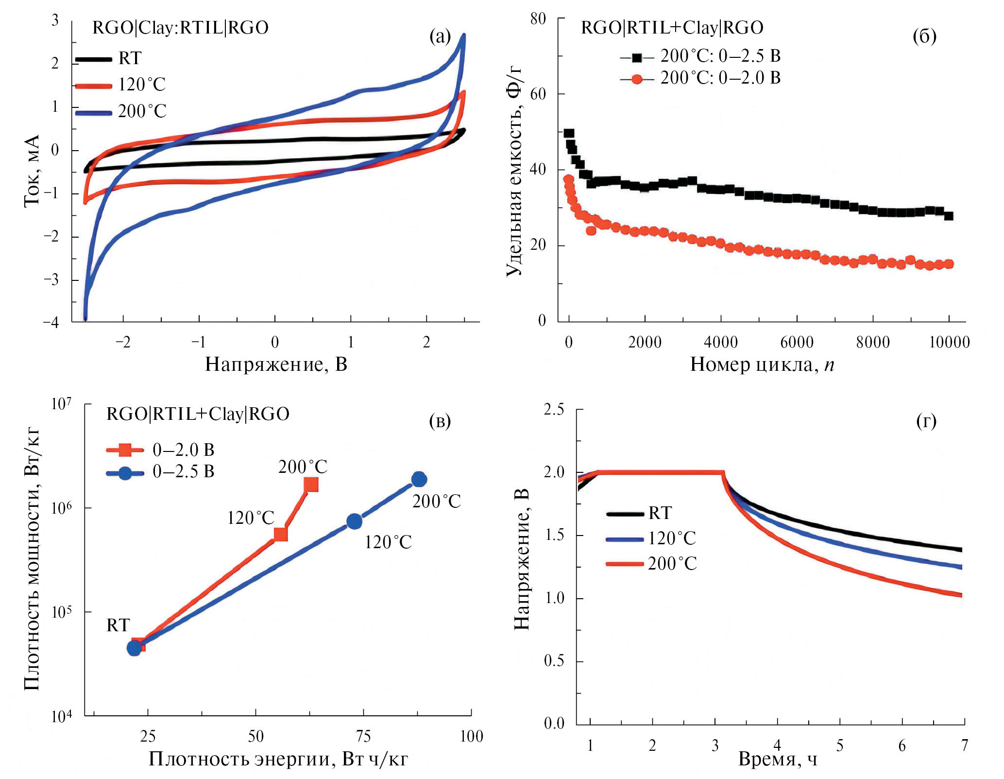 Рис. 2. (а) Циклические вольтамперограммы для ЭХСК на основе электролита глины: RTIL при 60 мВ/с и с окном потенциалов 5 В при различных температурах. (б) Циклическая стабильность конденсатора RGO| Глина: RTIL |RGO при +200 оC с окнами напряжения 2 В и 2.5 В. (в) Плотность энергии против плотности мощности конденсатора RGO | Глина: RTIL |RGO при различных температурах с окнами напряжения 2.0 В и 2.5 В. (г) Профили саморазряда ЭХСК на основе электролита глина: RTIL после заряжения до 2 В при постоянном токе, поддержания напряжения на уровне 2 В в течение 2 ч и последующего саморазрядка ЭХСК [90]. RGO – это восстановленный оксид графена (ВОГ).