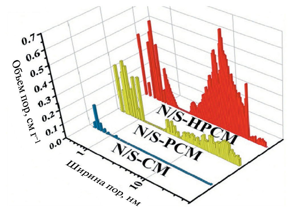 Трехмерные сотообразные пористые углеродные материалы с иерархической пористой структурой, легированной N/S, были получены в [100] из хитозанпротонной соли (([Chit][HSO4])) комбинированным методом двойного шаблона и самосборки без растворителя. Ключ к этой стратегии приготовления: не используются никакие растворители или катализаторы; материал F127 и додецилсульфат натрия используются соответственно в качестве мезопористых и макропористых темплатов, а ([Chit][HSO4]) может использоваться не только в качестве источника углерода, источника N/S, но и в качестве микропористого порообразователя при карбонизации. Одновременно существуют черты уникальной сотовой иерархической структуры пор c большой площадью удельной поверхности до 927 м2/г и эффективного легирования гетероатомами (N: 5.13 ат. %, S: 2.51 ат. %), что значительно улучшает электрохимические характеристики полученных углеродных электродов. С электролитом KOH была получена высокая емкость 302 Ф/г и превосходная стабильность при циклировании с сохранением 99% емкости в течение 5000 циклов. Примечательно, что собранные симметричные гибкие твердотельные ЭХСК сохраняют отличные емкостные свойства и стабильность при экстремальных температурах от –20 до +100 °C и при изгибе (0°~180°). Кроме того, в электролите Na2SO4 суперконденсаторы демонстрируют высокую плотность энергии 17.6 Вт ч/кг при плотности мощности 250 Вт/кг. Очень высокая производительность в большой степени обеспечивает большой потенциал для высокоэффективного накопления энергии для пористых углеродных материалов типа N/S (азот/сера) с трехмерной сотоподобной иерархической структурой. На рис. 3 приведены распределения пор по радиусам для трех разработанных электродов, легированных N/S, со следующими величинами УП: HPSM (927 м2/г); PCM (356 м2/г) и CM (293 м2/г).
