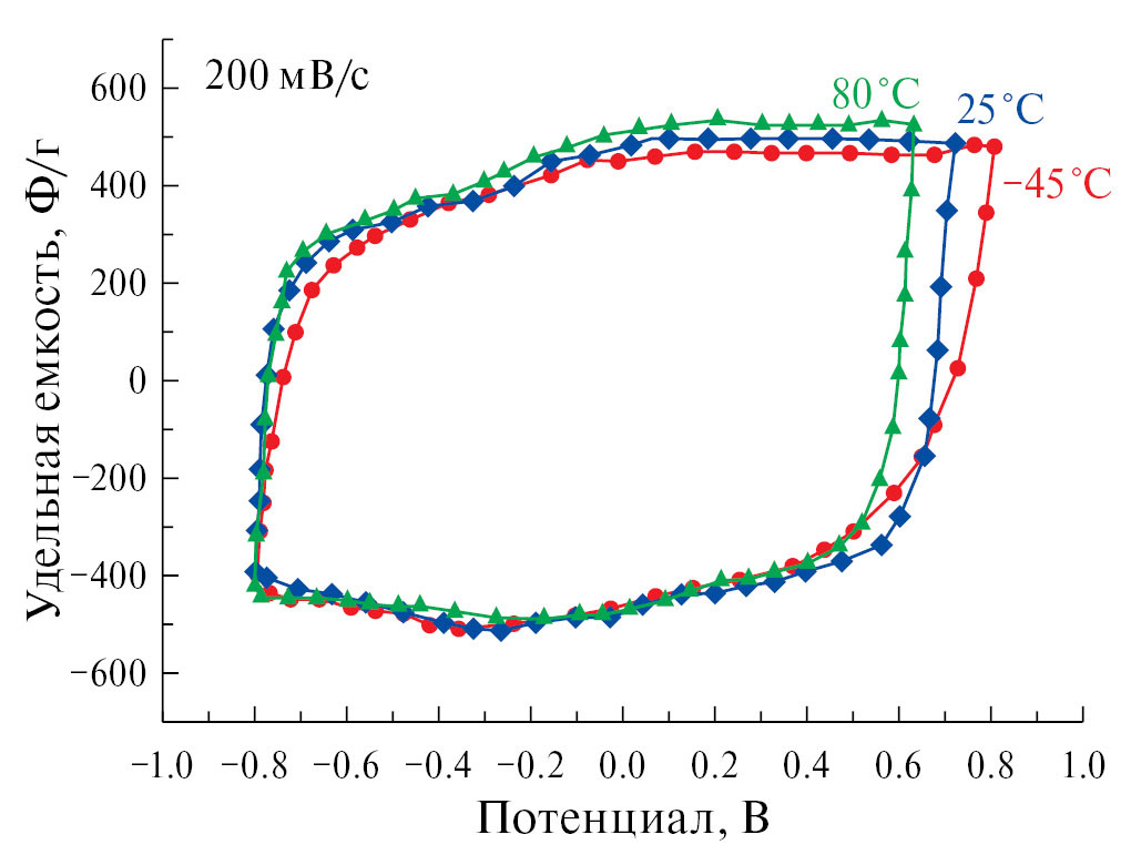 Электрохимические свойства большинства суперконденсаторных устройств быстро ухудшаются при отклонении рабочей температуры от комнатной. Чтобы использовать потенциал восстановленного оксида графена в суперконденсаторах при экстремальных температурах, требуется эластичный электролит, работающий в широком диапазоне температур. В работе [93] в ЭХСК с симметричными электродами из ВОГ была использована гибкая мембрана из твердого электролита с низким сопротивлением (SSEM) для работы в диапазоне температур от –70 до +220 °C. SSEM состоит из смеси поликатиона-полибензимидазола, легированного фосфорной кислотой (H3PO4), и этот материал продемонстрировал очень высокие значения проводимости в диапазоне от 50 до 278 мСм/см в диапазоне температур от –25 до 220 °C. Изготовленный ЭХСК имел максимальную емкость 6.8 мФ/см2 при +100°С. Плотности энергии и мощности варьировались от 0.83 до 2.79 мВт ч см–2 и от 90 до 125 мВт см–2 соответственно. Работа при высоких температурах обеспечивается за счет поликатиона в SSEM, закрепляющего анионы фосфатного типа, предотвращающего испарение H3PO4. Низкотемпературная работа суперконденсатора с SSEM объясняется тем, что матрица SSEM снижает температуру замерзания H3PO4 для поддержания структурной диффузии протонов.