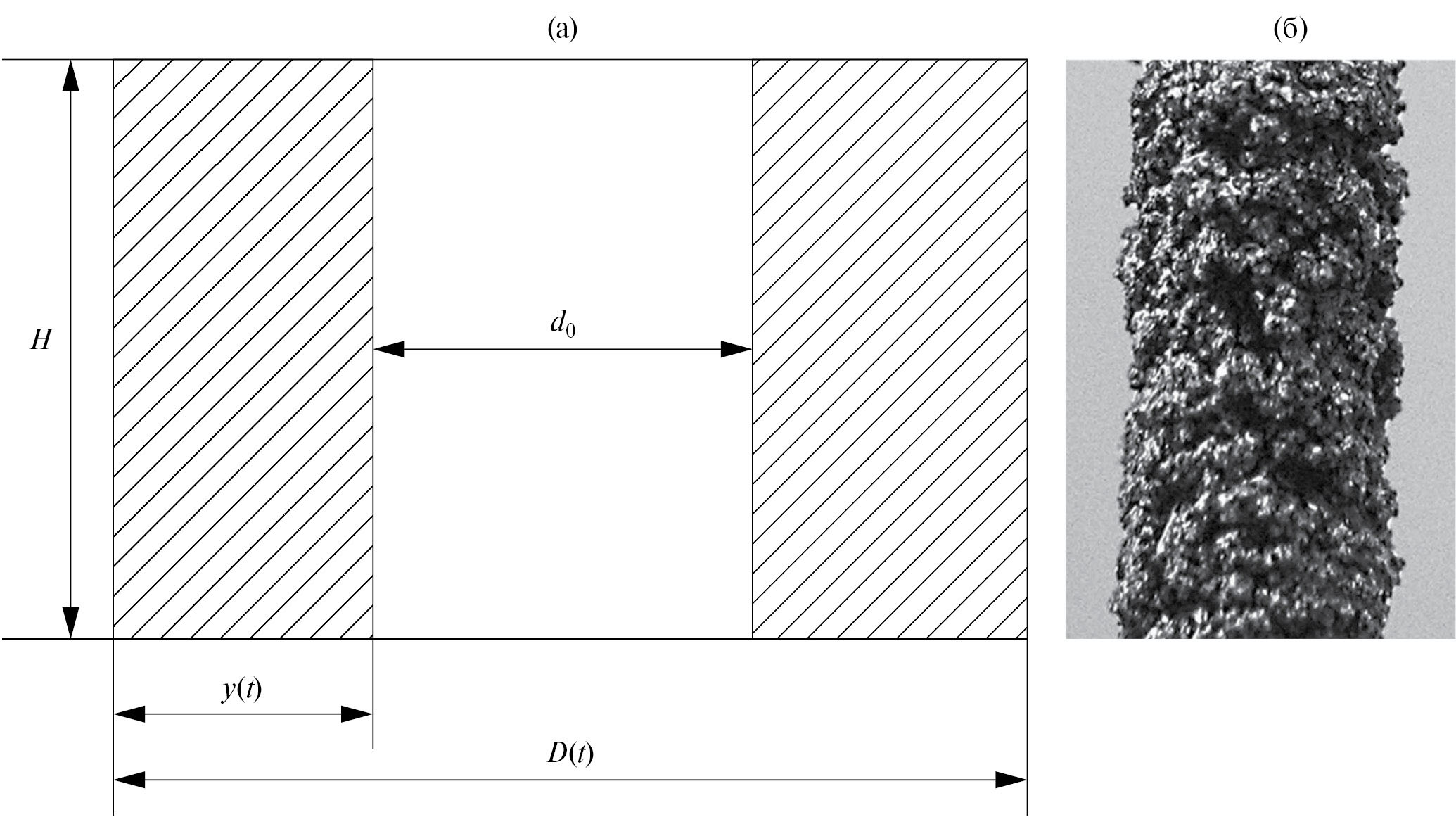 Диаметр электрода с осадком (D = d0 + 2y) измеряли по видеозаписи процесса его роста с помощью компьютерных программ KMPlayer и JRuler. Замеры проводили в трех местах по высоте электрода, затем находили среднее значение толщины осадка (y(t)) как половину прироста диаметра электрода с осадком (рис. 1, уравнение (1)):
