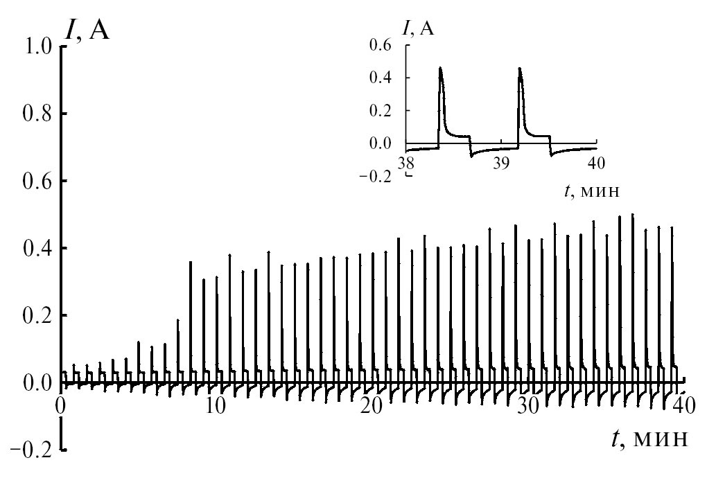В импульсных режимах форма профиля тока в импульсе и следующей за ним паузе сохраняется на протяжении всего времени электролиза (рис. 3). В начале импульса происходит резкий скачок тока и его спад, обусловленный уменьшением концентрации разряжающихся ионов цинка у поверхности электрода до нуля, затем следует площадка тока (рис. 3, врезка). Вследствие развития поверхности ток в импульсе увеличивался в течение электролиза.