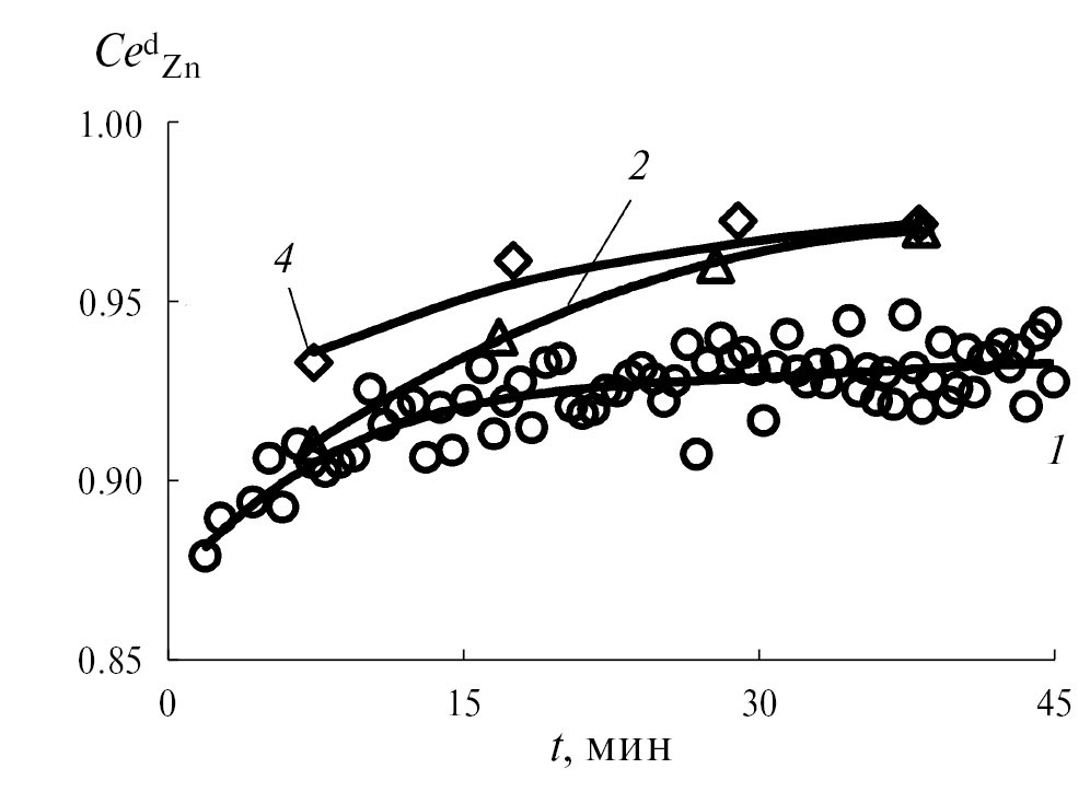 По объему выделившегося газа ΔVH2, stp за интервал времени Δt определяли дифференциальный выход водорода по току CedH2 и цинка CedZn. Дифференциальный выход по току соответствует выходу по току в конкретный промежуток времени: