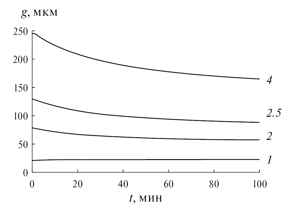 Изменение объема осадка за интервал времени Δt рассчитывали по уравнению (23) с учетом эмпирической зависимости толщины осадка от времени (уравнение (12)):