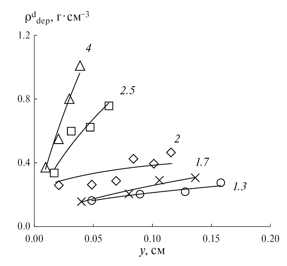Рис. 11. Изменение плотности рыхлого осадка цинка по его толщине. Цифрами на графике обозначены значения скважности. Маркеры – экспериментальные значения, полученные по уравнению (26) с использованием опытных значений y, CedZn и QZn; линии – аппроксимация по уравнению (30).