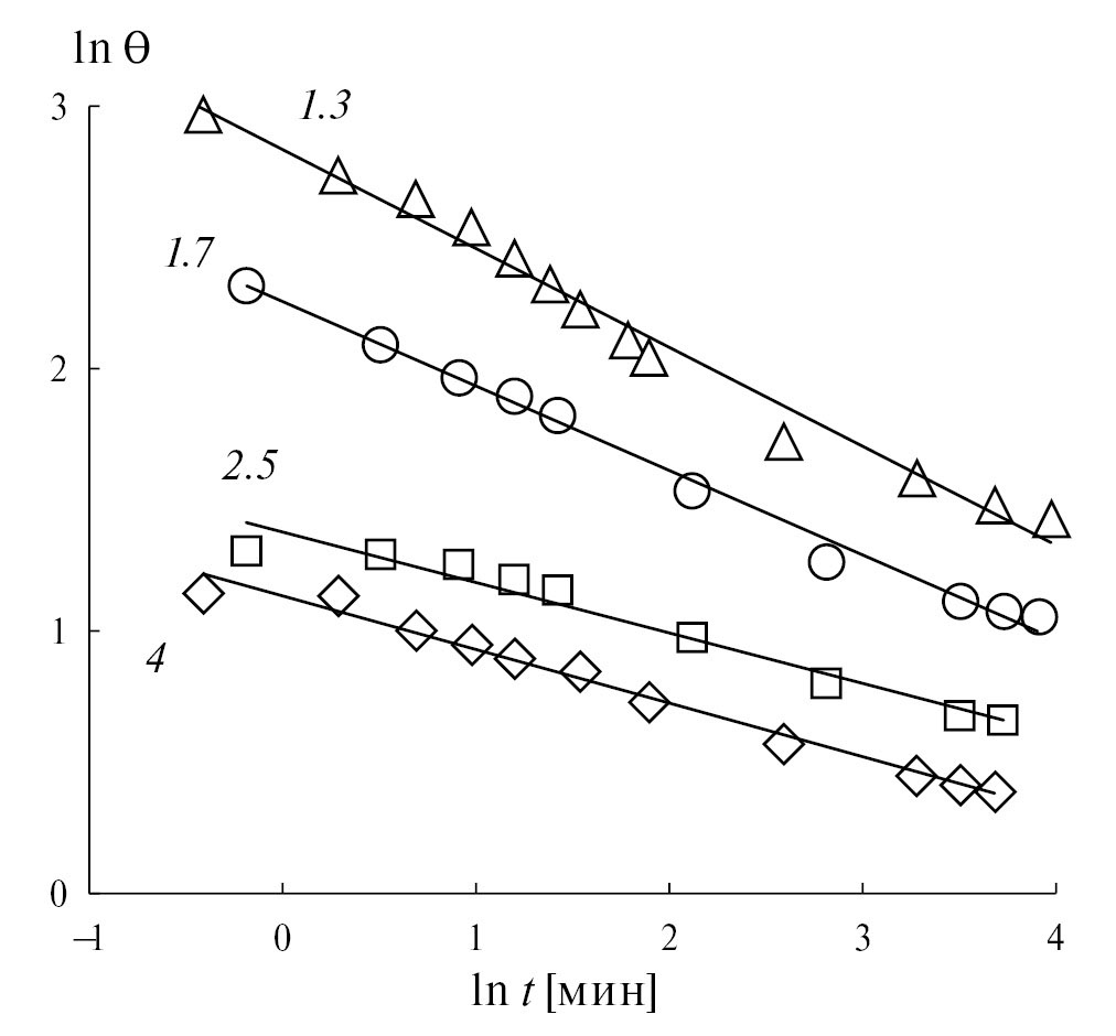 Расчеты показали, что в логарифмических координатах зависимость θ от времени линейна (рис. 12). Величина θ уменьшается в процессе электролиза, что подтверждает увеличение анодного количества электричества в период пауз. Повышение скважности приводит к общему снижению θ и, как следствие, к образованию более плотных осадков в импульсных режимах (рис. 11) при одинаковой толщине рыхлого слоя.