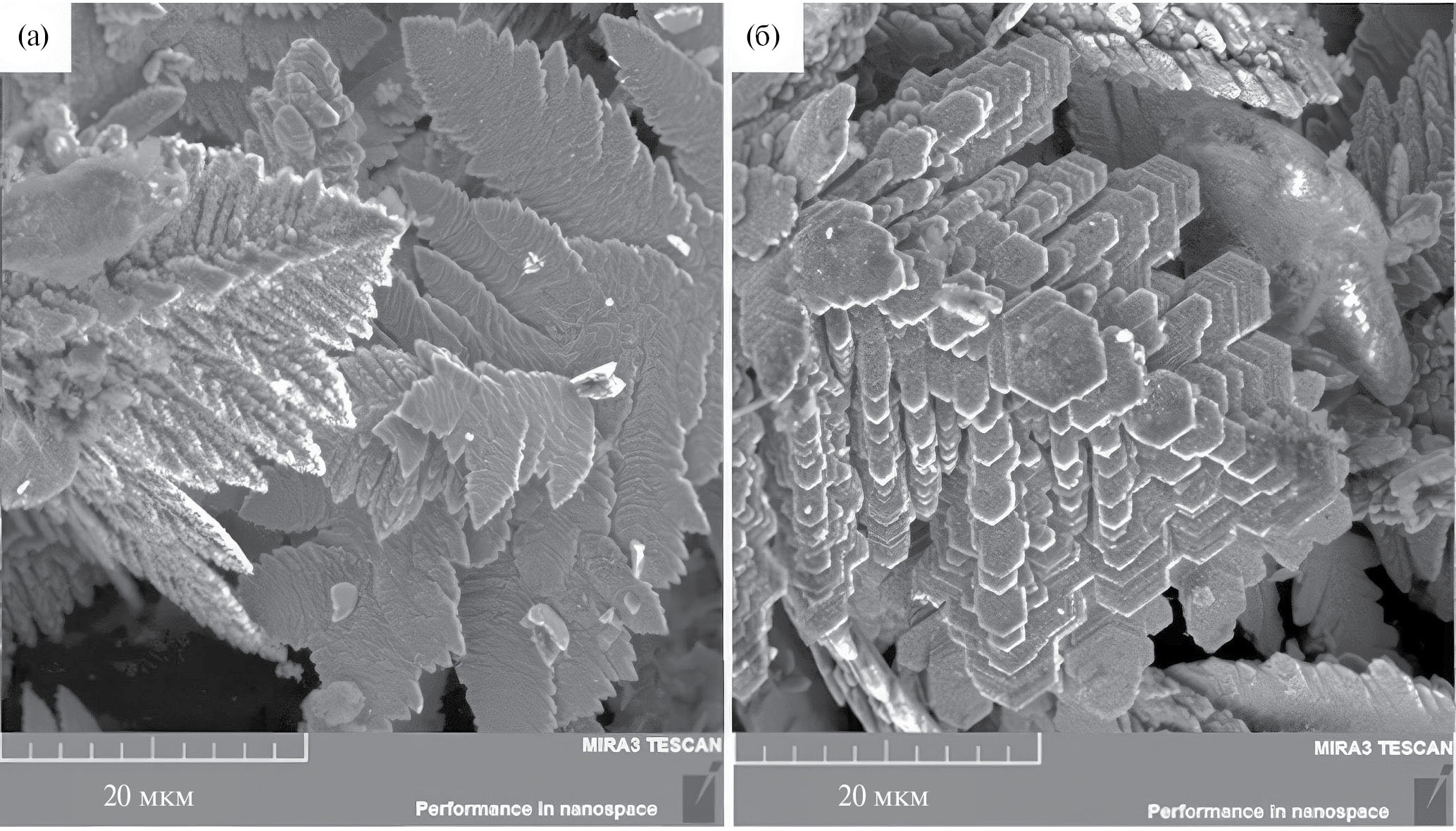 Модельные расчеты диаметра вершин и плотности осадков, полученных в разных режимах задания потенциала, соотносятся с наблюдаемым изменением морфологии частиц. При задании постоянного потенциала формируются дендриты из наноразмерных пластин, имеющие ажурную форму (рис. 13а). В режиме импульсного задания потенциала за счет анодных токов в период пауз в первую очередь растворяются последние образовавшиеся кристаллиты, а ветвление, реализующееся за счет образования и роста зародышей, становится невозможным. Концентрация в объеме осадка в период пауз повышается, и, как следствие, дендриты растут в основном за счет утолщения уже образовавшихся ветвей путем кристаллизации по винтовой дислокации. В результате формируются массивные папоротниковидные дендриты с четкой кристаллографической огранкой (рис. 13б).