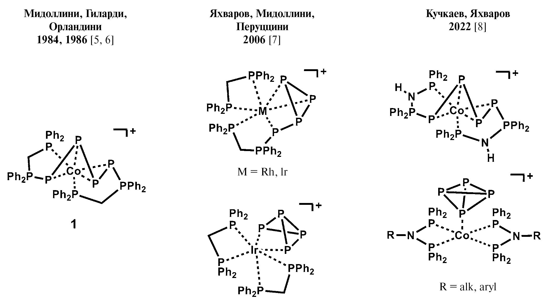 Ранее было показано, что комплексы подгруппы кобальта с дифосфиновыми лигандами проявляют высокую реакционную способность по отношению к белому фосфору. Продуктами таких взаимодействий являются комплексы, содержащие олигофосфорные Pn фрагменты (рис. 1) [5–8].