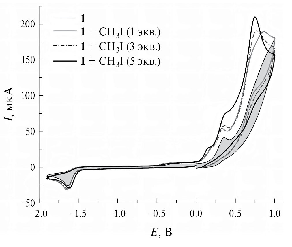 Также были проведены ЦВА исследования комплекса 1 в присутствии возрастающих количеств CH3I (рис. 3). Морфология катодной ветви кривой изменяется незначительно в присутствии CH3I, выражаясь в виде единственного пика восстановления при потенциале EpС1 = –1.65 В. Однако последующая развертка потенциала в анодную область сопровождается существенным изменением морфологии ЦВА-кривой. В присутствии CH3I на анодной ветви кривой ЦВА комплекса 1 появляются три пика окисления с потенциалами пиков E = 0.12 В, E = 0.36 В и E = 0.74 В. Появление этих сигналов свидетельствует о наличии в растворе иодид-анионов, образующихся в ходе реакции электрохимически восстановленных форм комплекса 1 с иодметаном. Важно заметить, что развертка потенциала в катодной области не достигает значения потенциала восстановления CH3I, следовательно, пики окисления иодид-анионов появляются вследствие протекания EC процесса. Это свидетельствует о медиаторном типе передачи электрона от восстановленной формы комплекса 1 к молекуле CH3I, что в свою очередь приводит к присутствию в растворе высокореакционноспособных метил-радикалов. Следовательно, при электрохимическом восстановлении комплекса 1 в присутствии CH3I в реакционной смеси создаются условия для функционализации комплекса 1 реакцией с метил-радикалами. С целью определения продукта такого взаимодействия был проведен препаративный электролиз смеси, содержащей комплекс 1 и CH3I.