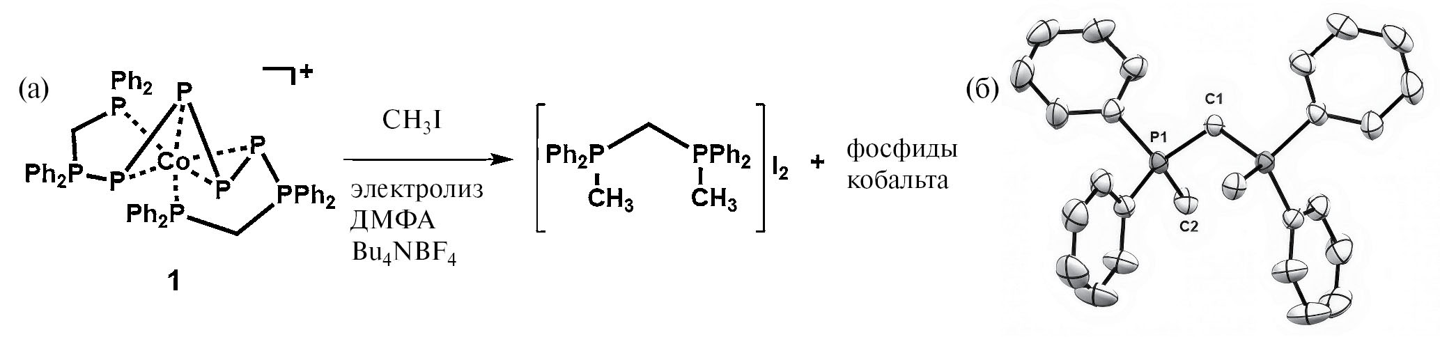 Препаративный электролиз смеси, содержащей комплекс 1, CH3I (5 экв.) и Bu4NBF4 в качестве фонового электролита, в ДМФА проводился в потенциостатическом режиме при потенциале пика восстановления комплекса кобальта 1 (EpС1 = –1.65 В отн. Ag/0.01 М AgNO3 в CH3CN) в ячейке с разделением анодного и катодного пространств. В качестве катода применялся стеклоуглеродный электрод, в качестве анода – металлический кобальт. По завершении электролиза раствор из катодного пространства ячейки был сконцентрирован, промыт гексаном и высушен с выделением твердого коричневого порошка. Добавление EtOH к последнему привело к выпадению светлого осадка – метиленбис(метилдифенилфосфоний) дииодида (схема на рис. 4), который в дальнейшем удалось перекристаллизовать из раствора в ацетоне и охарактеризовать физическими методами анализа, включая рентгеноструктурный анализ. Другими продуктами реакции являются фосфиды кобальта переменного состава, которые не удалось выделить в чистом виде.