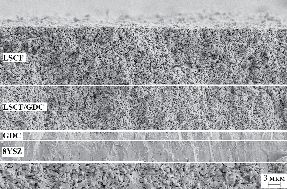 Поперечное сечение двухслойного 8YSZ/10GDC электролита и двухслойного LSCF/10GDC-LSCF катода представлено на рис. 3. Толщина слоя 8YSZ составляет около 5.4 мкм, а слоя 10GDC – около 2.4 мкм. Толщина функционального (LSCF/10GDC) и токосъемного (LSCF) подслоев катода составляет около 10 и 12 мкм соответственно. На изображении видна хорошая равномерность толщины всех функциональных слоев, а также хорошо сформированные внутренние интерфейсы ТОТЭ.
