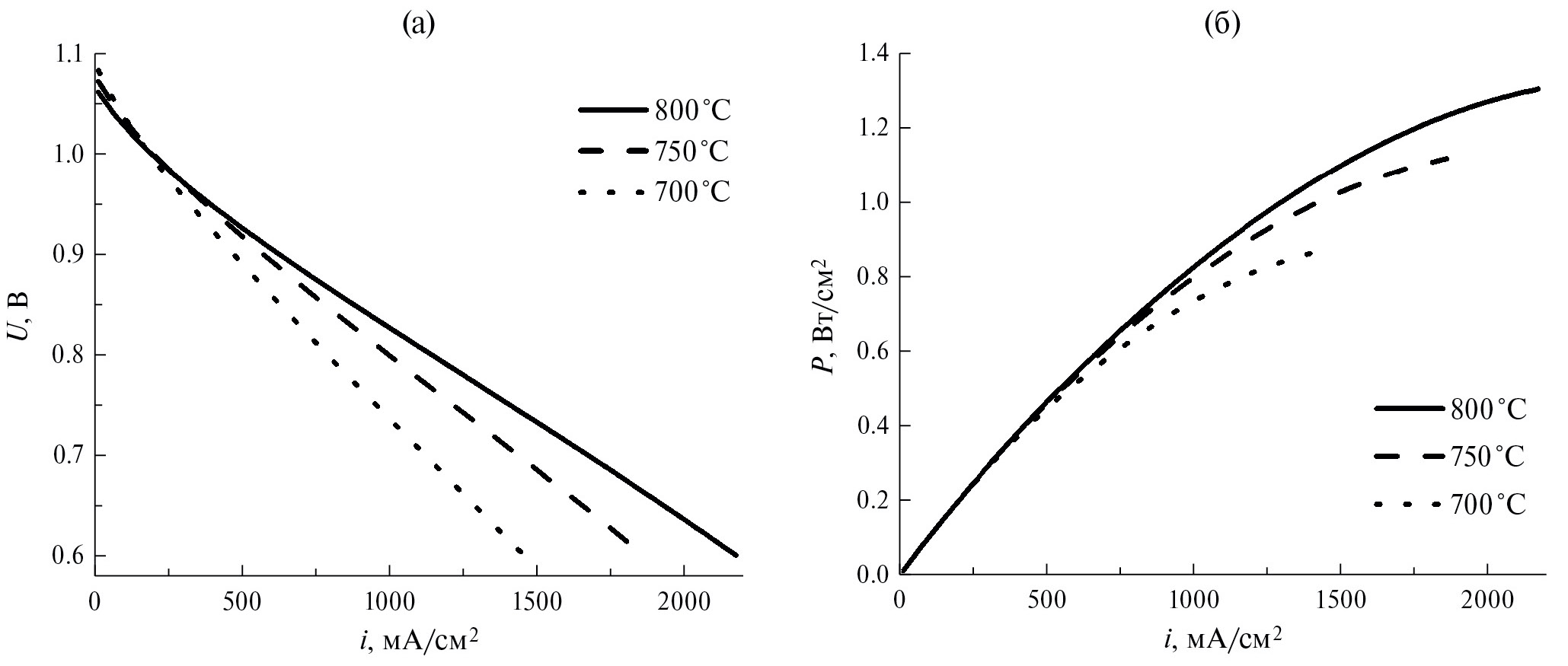 Исследование электрохимических характеристик проводилось на образцах диаметром 21 мм при рабочих температурах 700, 750 и 800°С при потоках воздуха (окислитель) и водорода (топливо) 200 мл/мин. Рабочая площадь электродов элемента составила 2 см2. Измеренное напряжение открытой цепи – более 1.05 В (рис. 4а), что свидетельствует о высоком качестве герметизации элемента в процессе измерений, а также отсутствии газовых и токовых утечек. В рабочей точке при напряжении 0.7 В удельная мощность составила 0.78, 1 и 1.17 Вт/см2 для рабочих температур 700, 750 и 800°С соответственно.