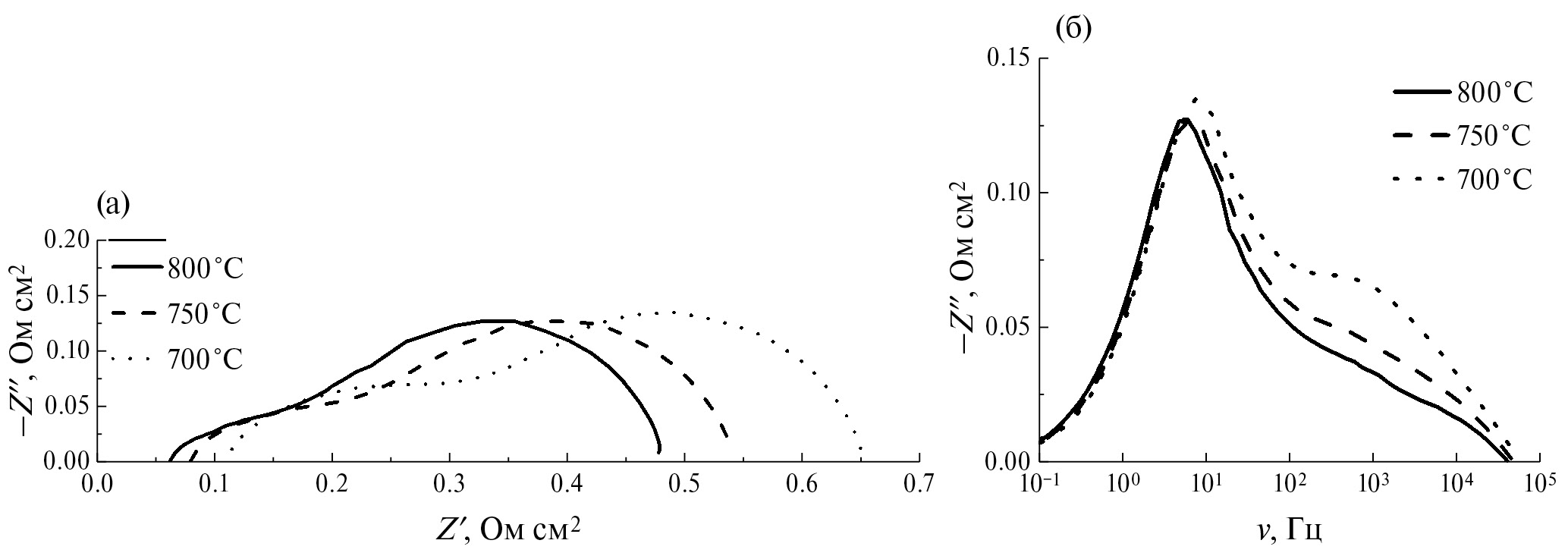 Из годографов импедансных спектров (рис. 5а) видно, что с понижением температуры растет сопротивление элемента – увеличивается омическое сопротивление элемента, а также растет вклад высоко- и среднечастотных процессов. Более наглядно это видно на зависимости мнимой части сопротивления от частоты (рис. 5б). Незначительный рост омического сопротивления (высокочастотная отсечка) с 44 до 94 мОм см2 связан с термоактивационным характером зависимости сопротивления твердого электролита от температуры. Стоит отметить, что сопротивление двухслойного 8YSZ/GDC электролита общей толщиной 7.8 мкм при температурах 800 и 700°С должно составлять 20 и 53 мОм см2 соответственно. Из этого следует, что омические потери, детектируемые во время эксперимента, содержат в себе не только сопротивление электролита, но и дополнительное сопротивление контактных областей, относительный вклад которого с понижением температуры падает из-за роста сопротивления электролита.