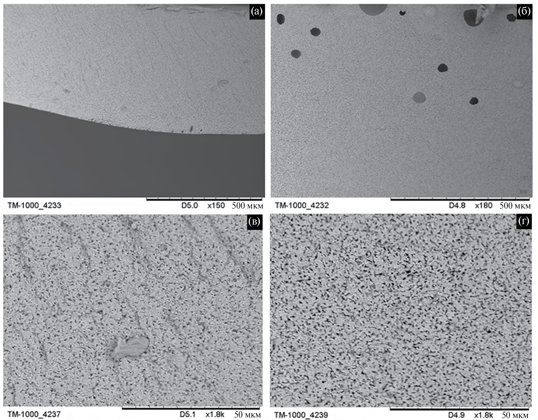 Для определения влияния параметров и режимов 3D-печати на микроструктуру анодных заготовок методом литья была изготовлена серия референсных образцов. Для этого в тефлоновую форму заливали пасту, которую затем помещали в сушильный шкаф при температуре 100°С. На рис. 4 приведены микрофотографии образцов, изготовленных методом литья (a, в) и струйной печати (б, г) с их последующим отжигом. Из микрофотографий видно, что в обоих случаях образцы имеют схожую микроструктуру, однако на сколе видно, что структура образца, полученного методом струйной печати, более пористая. В обоих случаях распределение микропор однородно, но в образце, изготовленным методом струйной печати, присутствуют макропоры, которые формируются в результате удаления органических компонент при сушке с последующим температурном отжигом.