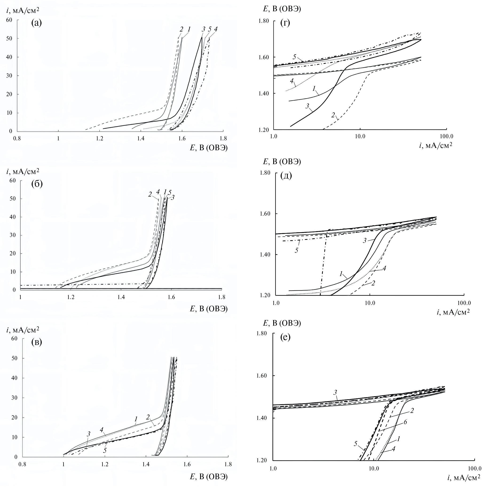 Рис. 2. Вольтамперограмма Ir–Mo–Cr анодов (ms = 0.321 мг/см2). 25% О2 в плазме Ar. Тто, °С: 1 – без термообработки; 2 – 250; 3 – 350; 4 – 400; 5 – 500. Раствор электролита 0.5 М Н2SO4. Тизм, оС: а – 25, б – 50; в – 90, г – 25, д – 50, е – 90. Скорость развертки – 50 мВ/с.
