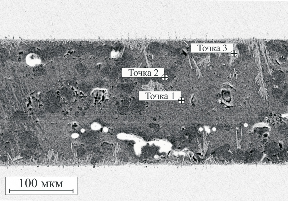 Для ЭДРС-анализа склейки герметик–сталь мы готовили склейки с выдержкой при 940°С в течение 3 ч. Увеличенная длительность термообработки была необходима для того, чтобы расширить зону взаимодействия герметик–сталь и облегчить получение экспериментальных данных. Увеличенное время выдержки при высокой температуре приводит к интенсивному росту зоны реакции с образованием дендритов глубоко в слой герметика. На рис. 5 показаны точки, в которых исследовался элементный состав материала на поперечном сечении склейки герметик–сталь, а в табл. 2 приведены данные о содержании элементов. Следует отметить, что метод ЭДРС не позволяет обнаружить бор, поэтому бор не указан в табл. 2.