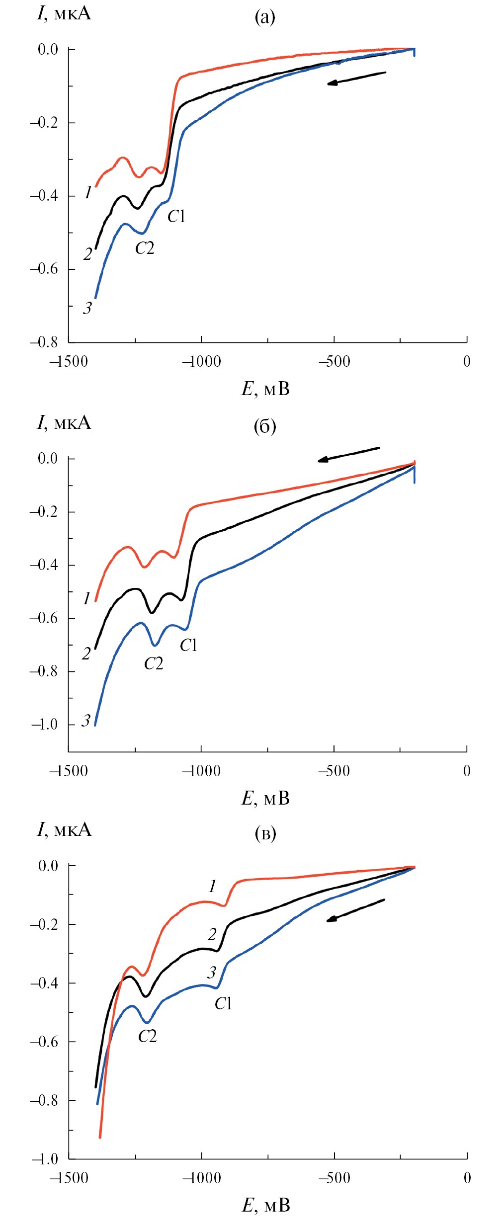 Рис. 1. Катодные вольтамперограммы Au/SAMs электродов, полученных при выдержке 120 с при Е = −200 мВ в деаэрированном 0.02 М растворе: 1 — LiOH, 2 — NaOН, 3 — KOH в присутствии 0.1 мМ тиолов с разной концевой группой: –CH3 (а), –CH2OH (б), –NH2 (в).