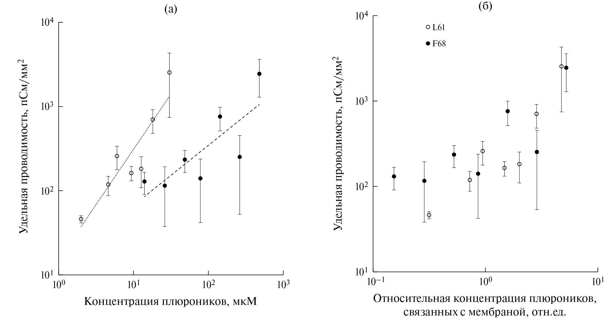 Рис. 1. Экспериментальные зависимости удельной проводимости азолектиновых мембран (а) от концентрации L61 и F68 в окружающем растворе, (б) от относительной концентрации плюроников, связанных с мембраной; аппроксимирующие зависимости удельной проводимости g от концентрации C плюроников в растворе: gL₆₁ = 15.3 × C¹.³ и gF₆₈ = 12.9 × C ⁰.⁷ пСм/мм²; проводимость контрольных мембран 42 ± 6 пСм/мм². Прикладываемое напряжение не превышало 50 мВ. Окружающий раствор: 0.1 М KCl. Приведены стандартные ошибки.