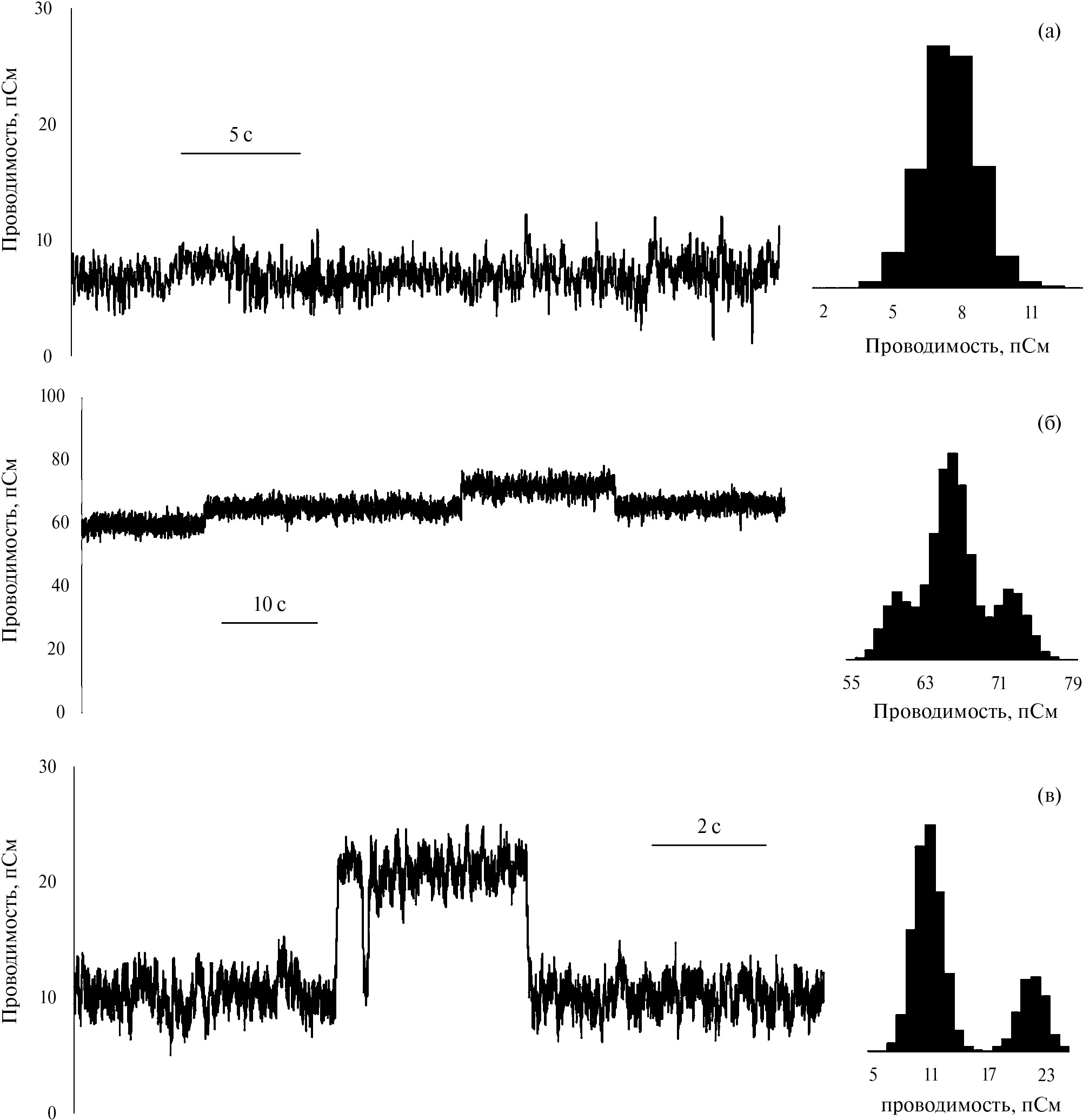 Рис. 2. Ступенчатые треки и гистограммы проводимости азолектиновых мембран в 0.1 М KCl: (а) контроль,(б) с добавкой 12 мкМ L61, (в) 26 мкМ F68. Напряжение на мембране 25 мВ.